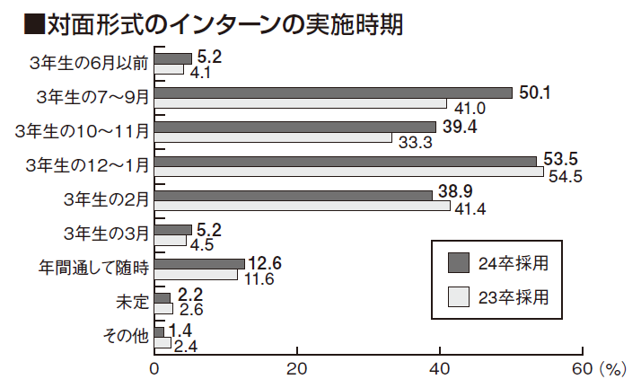 2024年卒学生を対象とするインターンシップを「3年生の夏や秋」に実施した企業の割合が前年度と比べ増加。一方、12月以降に開催した企業の割合は減少しており、より早い時期に学生との接点を持ちたいという企業の意向が見て取れます。