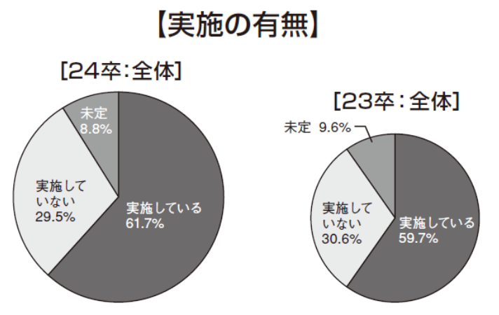インターンシップを「実施している」企業は前年比2.0ポイント増となる61.7%。実施企業を上場有無で比べると、上場企業は80.8%、非上場企業は58.6%と差があることが分かりました。予算や人手をやり繰りしやすい上場企業の方がインターンシップを実施しやすい状況にあると言えます。