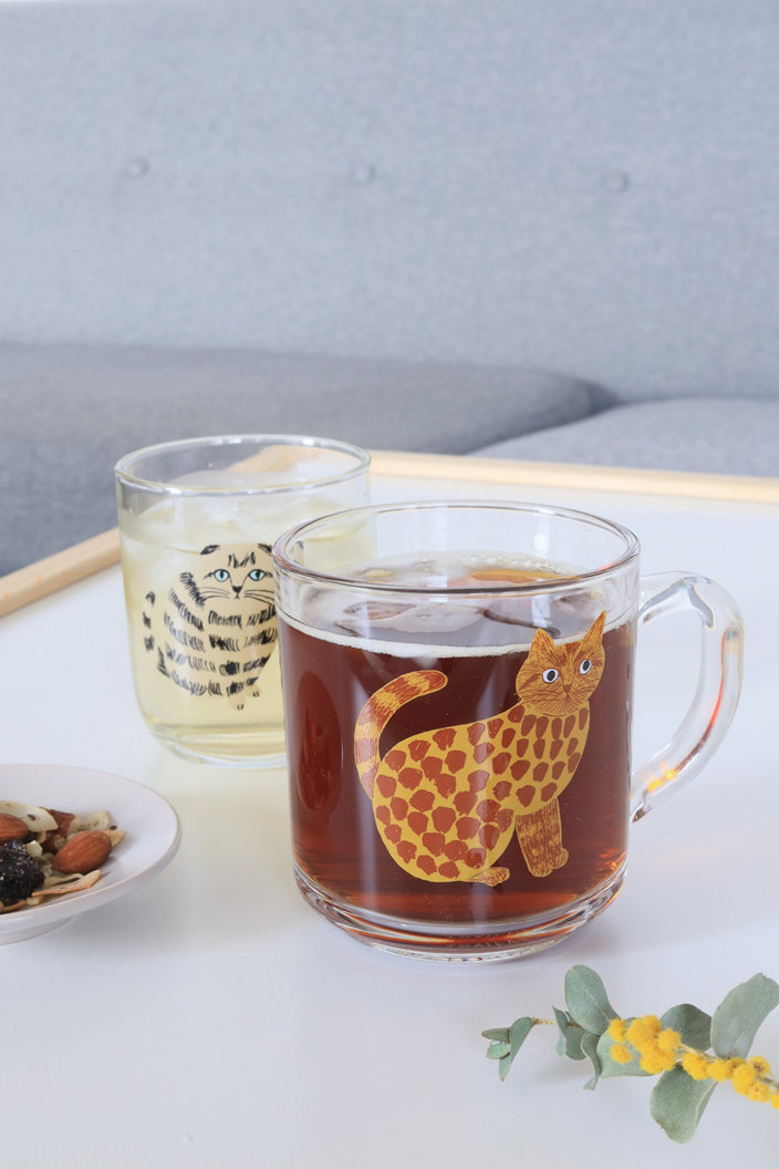 イラストレーター・松尾ミユキさんが描くネコモチーフの食器やファブリック小物などを集積。●キャットグラスマグ・・・990円(ユニコン)