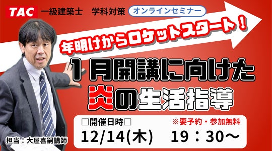 【TAC建築士講座】オンラインセミナー開催のお知らせ 一級建築士(学科) 年明けからロケットスタート!1月開講に向けた炎の生活指導