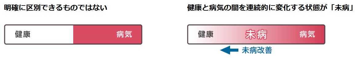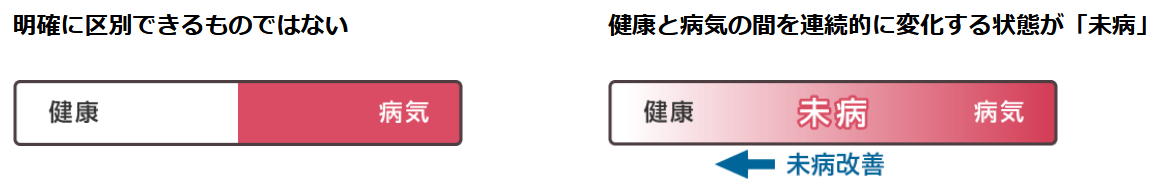 私たちの心身の状態は、健康と病気の間で連続的に変化しています。「未病(ME-BYO)」は、その状態を表す言葉。日常の生活において「未病改善」により、健康な状態に近づけていくことが大切。