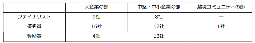 本年度は、従業員が1,000名以上の企業を「大企業の部」、1,000名未満の企業を「中堅・中小企業の部」、企業や個人の実践・探究型コミュニティを「越境コミュニティの部」として審査し、以下の通り入賞企業を選出しました。