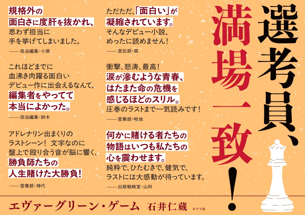 第12回ポプラ社小説新人賞(2023年)で選考員の満場一致で選ばれた本作は、世界有数の頭脳スポーツ「チェス」に出会い、その面白さに魅入られた4人の若者の物語。彼らがチェスを通してそれぞれの人生と向き合い、戦っていく姿に心が熱くなります。