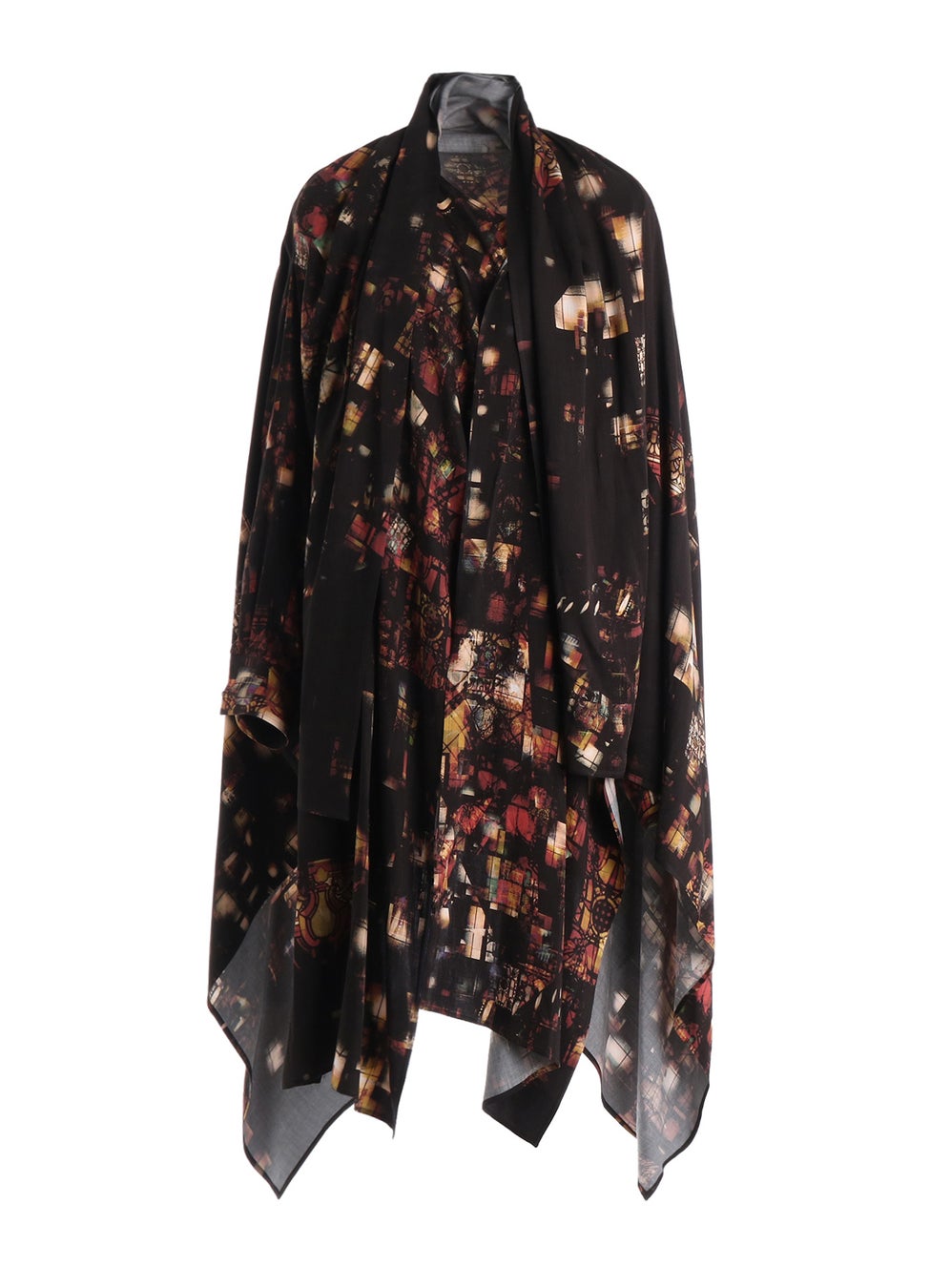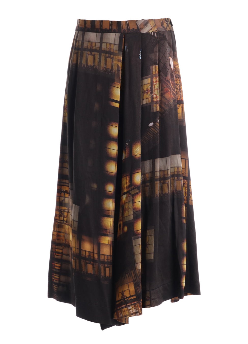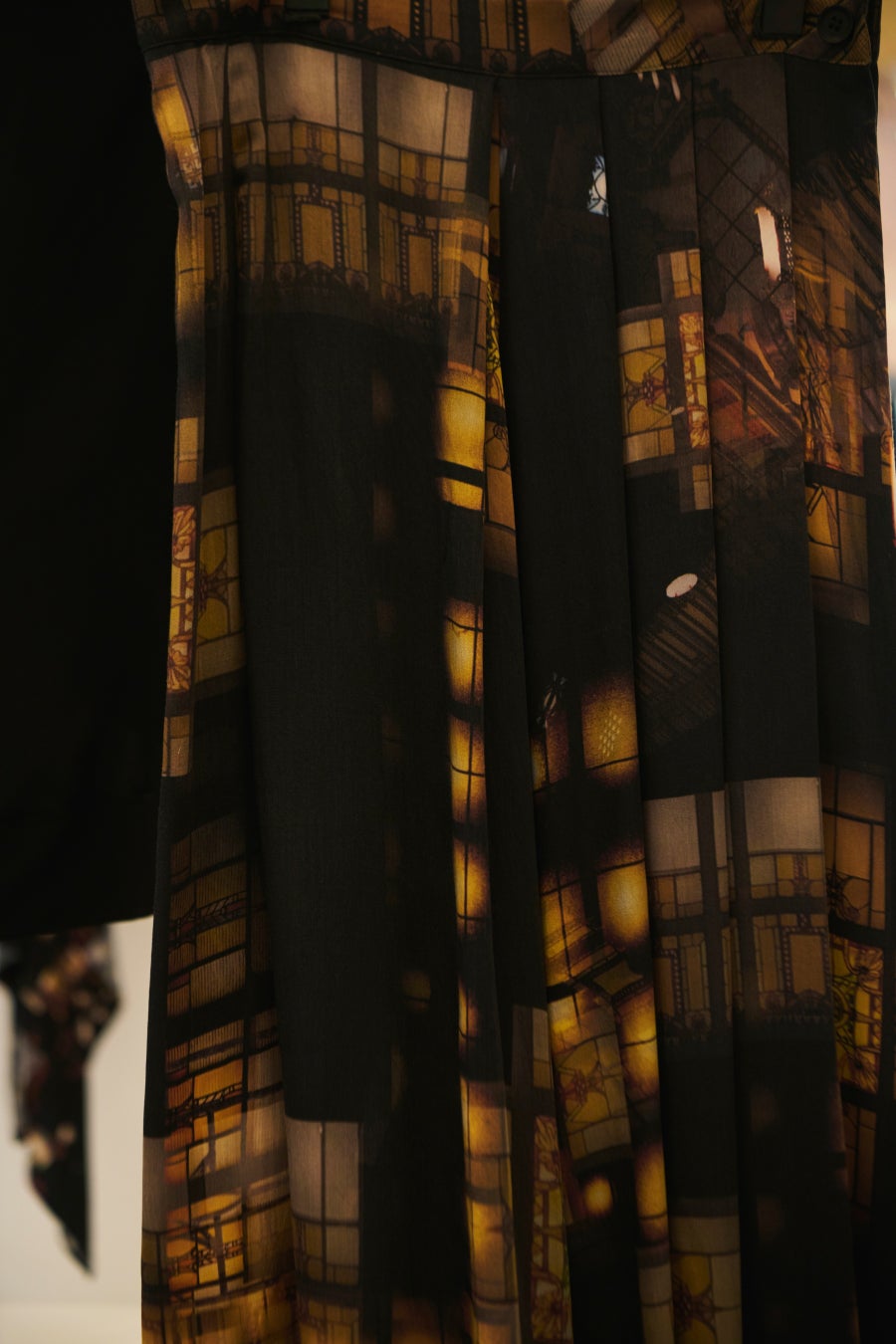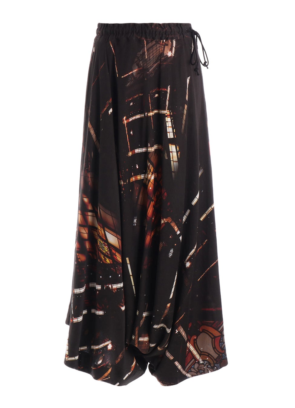 アール・デコ様式のステンドグラスや幾何学模様から着想を得たプリントパンツ。構造的な幾何学模様が散りばめられ、どことなく三角形を想起させる柄がシルエットと呼応するデザイン。