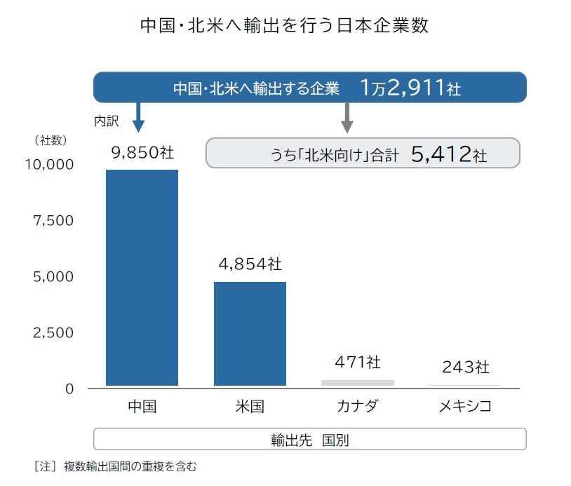 日本から北米・中国市場向けに製品・サービスを直接・間接的に販売(輸出)する日本企業は、2025年1月時点で国内1万2911社に上ることが分かった。このうち、「中国」向けが9850社と最も多く、「アメリカ合衆国(米国)」(4854社)、「カナダ」(471社)、「メキシコ」(243社)と続いた。中国やカナダ・メキシコへの輸出は、各国拠点で加工・組立工程を担い、米国市場に輸出するといった供給網も含まれる。トランプ米大統領は既に中国向け追加関税を発動しており、メキシコ・カナダ両国に加え、日本にも関税が発動するシナリオの場合、少なくとも国内約1.3万社の企業活動に影響が及ぶ可能性がある。