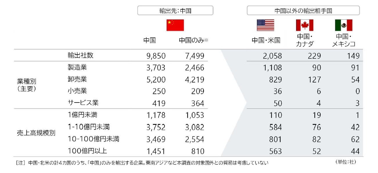 株式会社帝国データバンクは、保有する企業信用調査報告書ファイル(CCR、約200万社収録)から、輸出先(得意先・販売先)に「中華人民共和国」および「アメリカ合衆国」「カナダ」「メキシコ」各国内の企業(現地法人、現地子会社などを含む)と取引のある日本企業について調査・分析を行った。