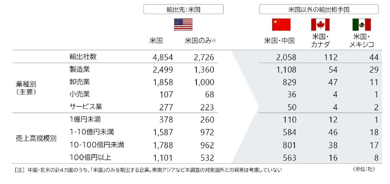 日本から北米・中国に製品・サービスを輸出する日本企業は2025年1月時点で1万2911社に上った。このうち、「中国」向けが9850社と最多で、「米国」向けは4854社。業種別では「卸売業」が最多の6348社、「製造業」が5211社と続く。企業規模別では売上規模1-10億円未満が最多だった。