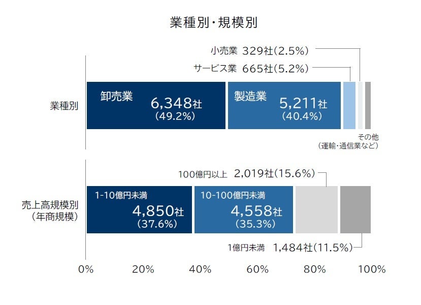 業種別にみると、最も多いのが『卸売業』で6348社となり、全体の49.2%を占めた。『製造業』(5211社、40.4%)と合わせ、2業種で全体の約9割を占めた。『卸売業』では、白物家電をはじめ電化製品を扱う「機械器具卸売業」(2026社)が多かったほか、「飲食料品卸売業」(669社)など食品関連が上位となった。製造業では、金属工作機械などの「一般機械器具製造業」(1444社)が多かったほか、「電気機械器具製造」(787社)、「化学工業、石油・石炭製品製造業」(540社)などが上位で、日本酒人気などを背景に「食料・飼料・飲料製造業」(320社)も多かった。