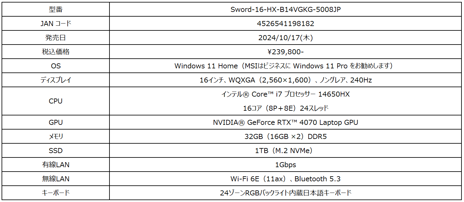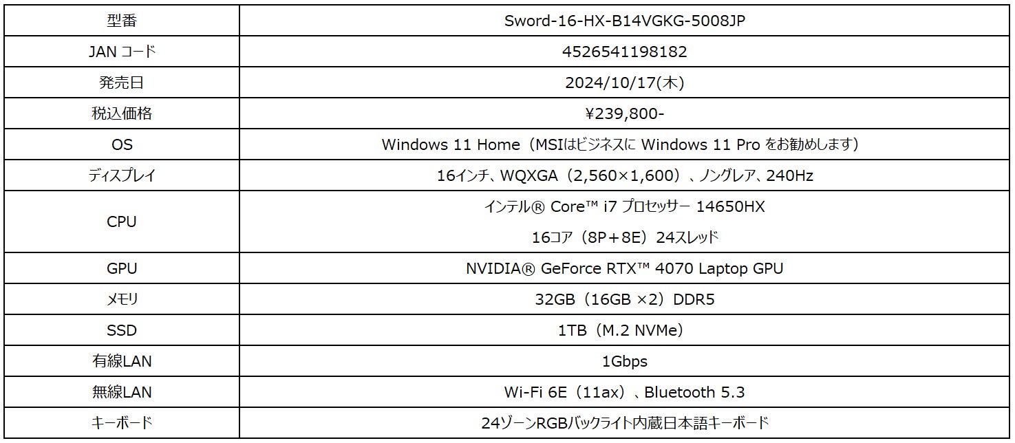 ・Sword 16 HX B14Vシリーズ製品ページ:https://jp.msi.com/Laptop/Sword-16-HX-B14VX