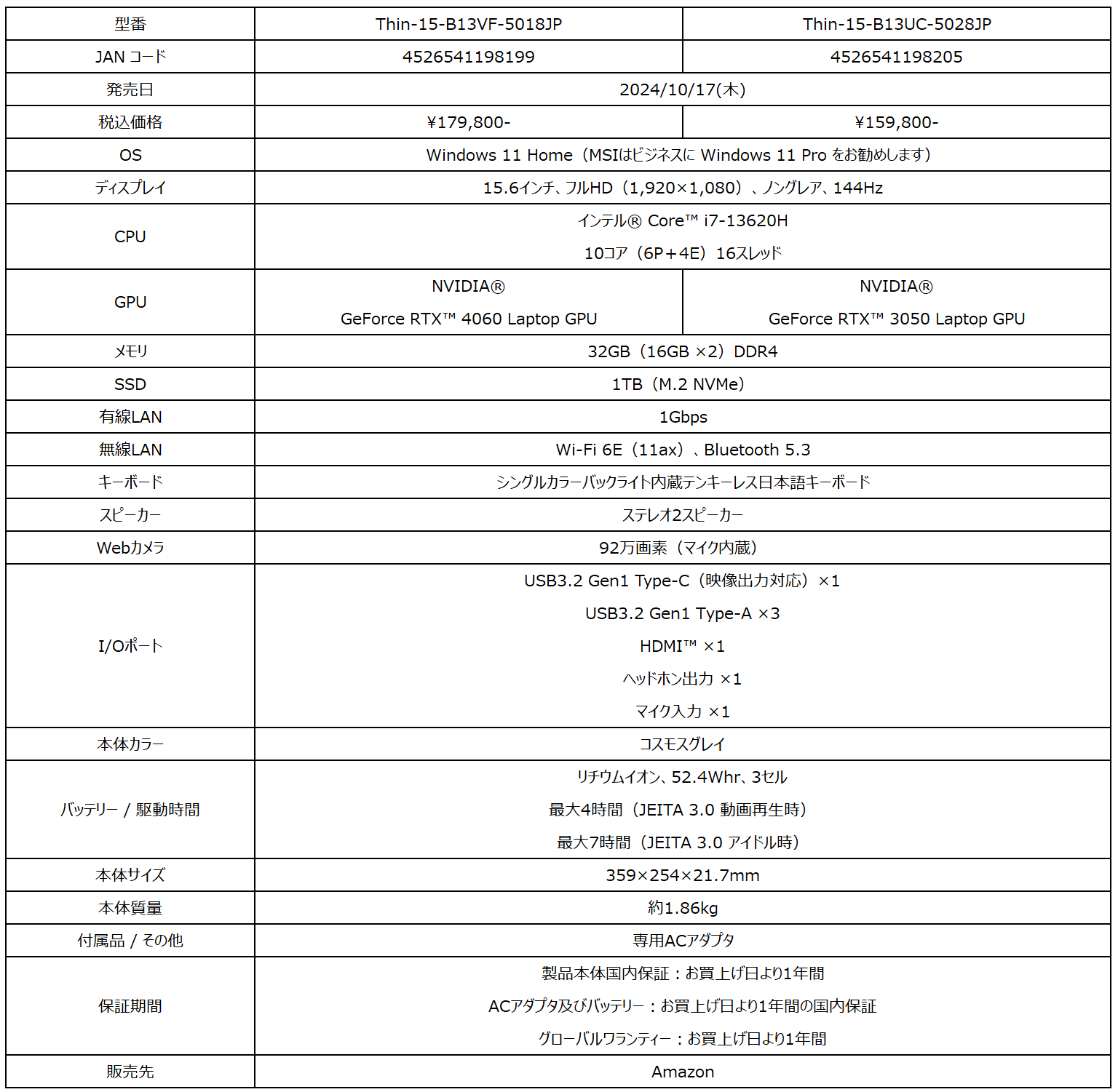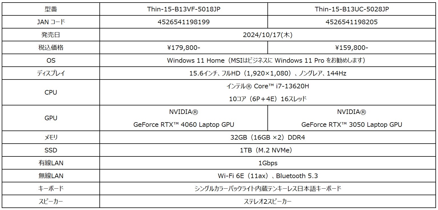 また、薄さ21.7mm・軽さ1.86kgの薄型・軽量デザインの本体に「GeForce RTX™ 4060/3050 Laptop GPU」を搭載し、いつでもすぐにゲームが遊べる15.6インチゲーミングノートPC「Thin 15 B13V/U」シリーズのAmazon限定モデルを2024年10月17日(木)より同時発売いたします。