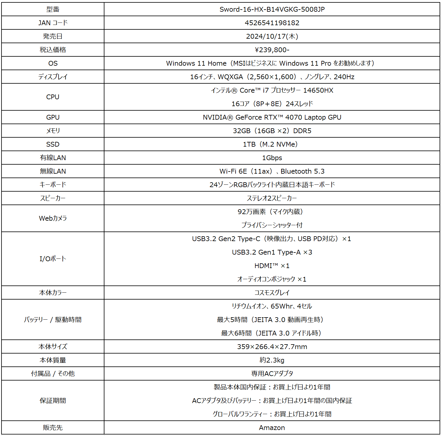 勝つための性能・機能を求めるeスポーツゲーマーに最適なハイスペックゲーミングノートAmazon限定モデル「Sword-16-HX-B14VGKG-5008JP」を2024年10月17日(木)より発売