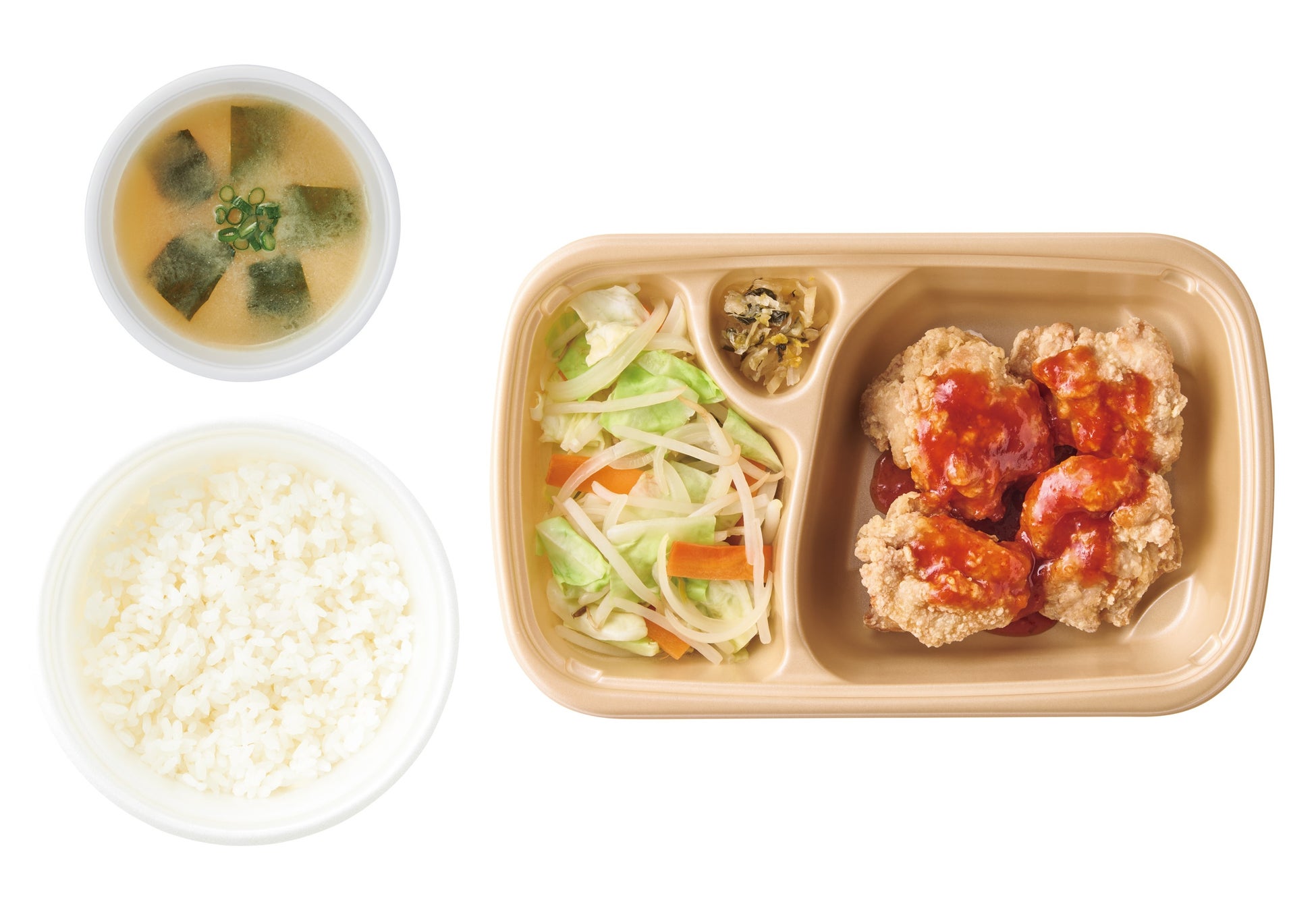 『鉄板鶏チリ定食』は、ねぎ・しょうが・にんにくの香りに豆板醤と香辛料が効いたトマトベースの特製チリソースを、香ばしい竜田揚げにたっぷりとかけたくせになる辛味が特徴です。