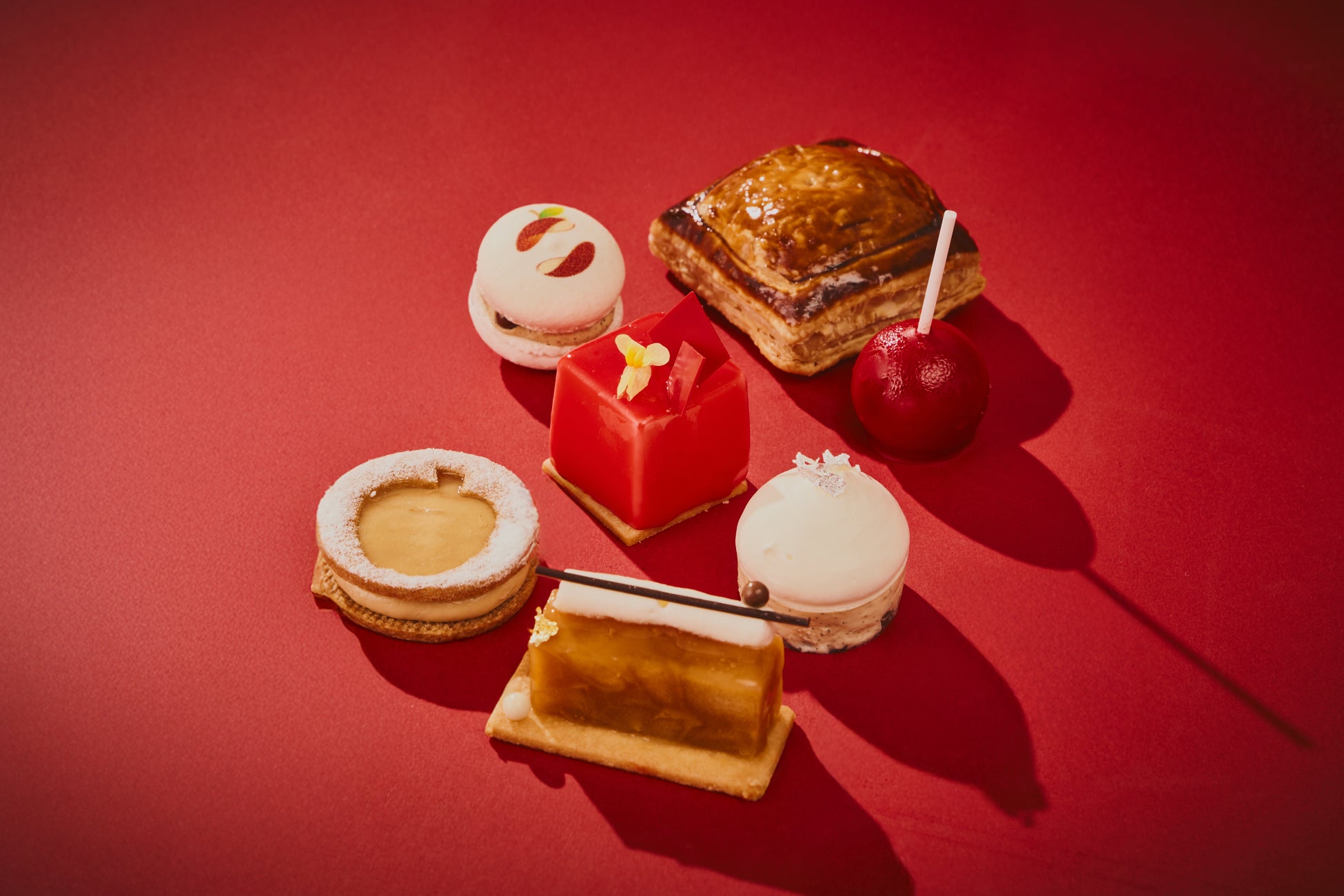 シナモン香るやわらかく煮たりんごをぎゅっと詰め込んだ、温かな「アップルパイ」は、りんごのお酒“カルヴァドス”を効かせたカスタードクリームが深みのある味わい。甘く煮詰めてキャラメリゼしたりんごがスタイリッシュに彩る「タルトタタン」、コロンと見た目が愛らしく、口に入れても驚きの「りんご飴風のりんごジュレ」、輝くような赤色の「りんごムース」など。手に取る順番に迷いそうな、華やかなスイーツがずらりと登場します。