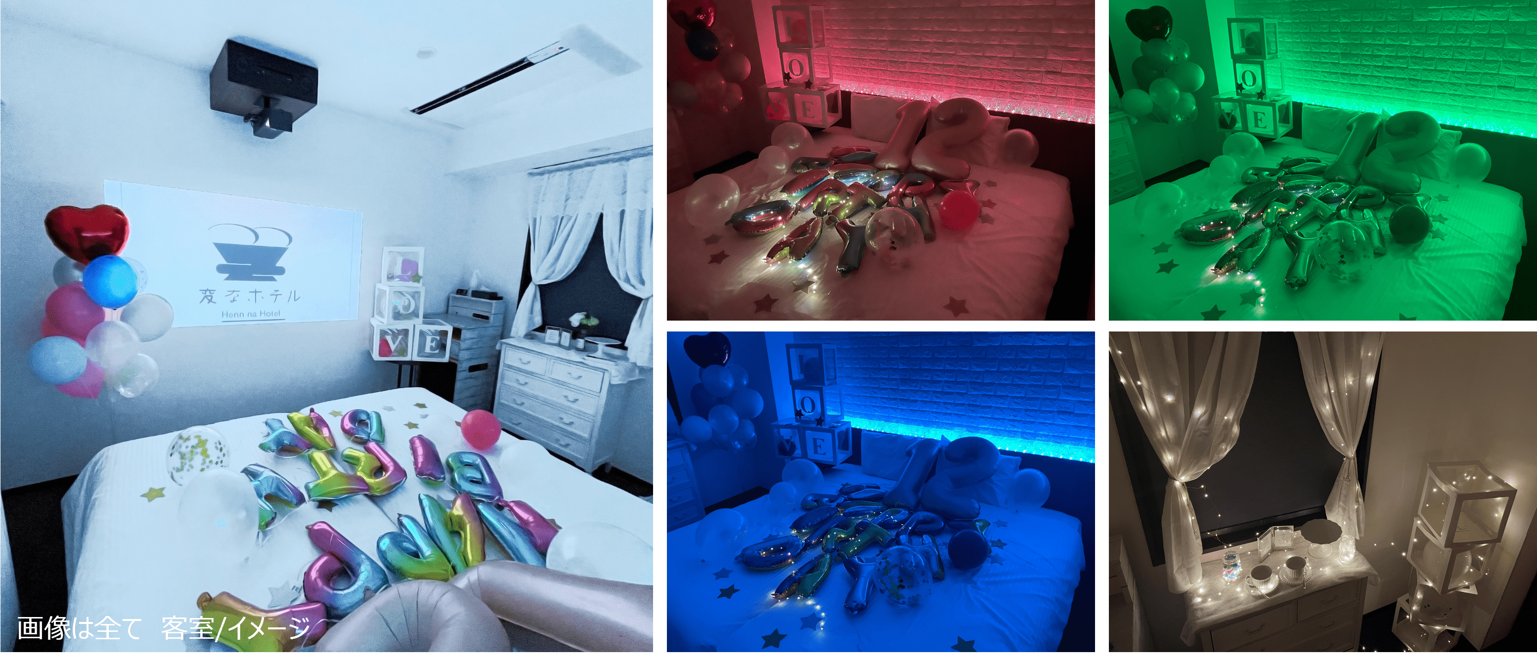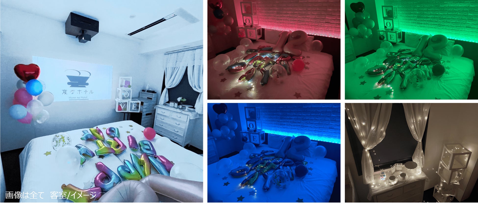 「推し活応援ルーム」には、50色のバルーンと50色のマスキングテープをご用意しており、壁を自由に飾り付けしていただけます。ライティングは1600万色からご選択いただき、ご自由に設定いただけます。また、ケーキスタンド、カトラリー、カップ&ソーサー、テーブルクロスを設置しておりますので、お客様ご自身で小物をご用意いただく必要がございません。さらに80インチのシアター・ブルーレイレコーダーも備えており、テレビやブルーレイディスクの他、客室に設置のGoogle Chromecastをご利用いただくことで、お客様のスマートフォンやタブレット、動画配信サービスなどのコンテンツを大画面でご覧いただくことも可能です。価格は素泊まり15,000円~、朝食付16,760円~(いずれも1泊1部屋あたり、税サ込)