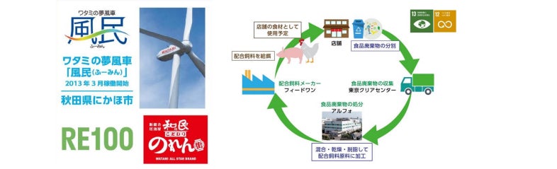ワタミは、使用電力を100%再エネにすることを目指す国際イニシアチブ「RE100」に2018年3月から加盟し、再生可能エネルギーを利用した循環型6 次産業モデル「ワタミモデル」を推進するなど、早くから持続可能な循環型社会づくりに取り組んでまいりました。「和民のこだわりのれん街」は、そんな「ワタミモデル」の確立に向けたSDGsモデル店舗となっています。グループ会社であるワタミエナジー株式会社から、秋田県にかほ市にあるワタミの風車「風民(ふーみん)」で発電したFIT電気を非化石証書とトラッキング(ひもづけ)し、発電所を特定した環境価値を付随した100%再生可能エネルギーで店舗の使用電力を賄うほか、店舗では食品廃棄物の分別と計量を行い、食品廃棄の原因を特定して食品廃棄を減らす対策を行っております。また店舗から排出された食品残さはリサイクラーを通じて配合飼料原料に再資源化しており、今後は再資源化された飼料を使用して生産された農畜産物を、店舗の食材として使用する食品リサイクルループの構築を目指し、循環型社会の形成につとめてまいります。