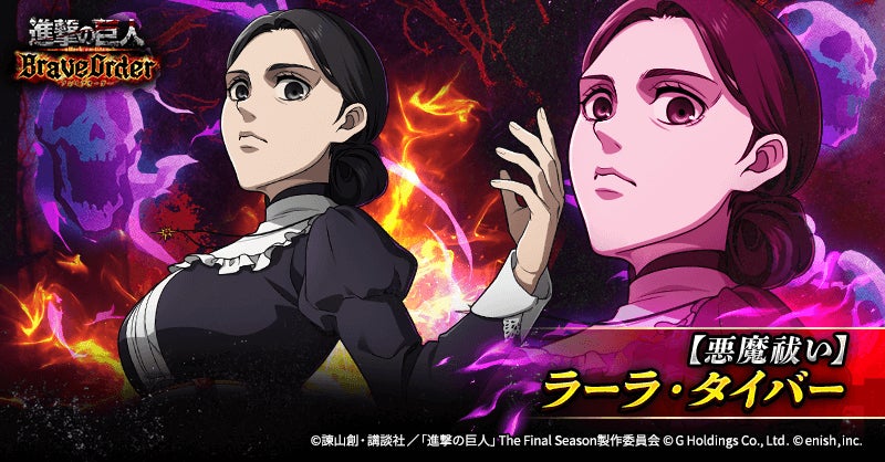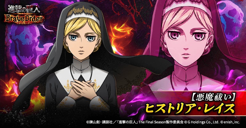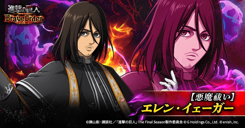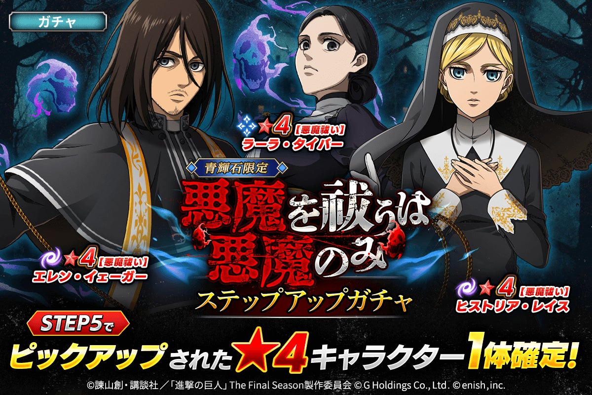 株式会社enish(本社:東京都港区、代表取締役社長:安徳 孝平、以下enish)は、アニメ『進撃の巨人』のスマートフォンゲーム最新作「進撃の巨人Brave Order」にて、2025年7月11日(金)より、「悪魔を祓うは悪魔のみ」を開催!また、本日より新登場の【悪魔祓い】エレン・イェーガー、【悪魔祓い】ヒストリア・レイス、【悪魔祓い】ラーラ・タイバーがピックアップされた「悪魔を祓うは悪魔のみガチャ」も開催!その他、最新情報はゲーム公式サイト・ゲーム公式X(旧Twitter)アカウントにて随時公開して行きますので、ぜひご覧ください。