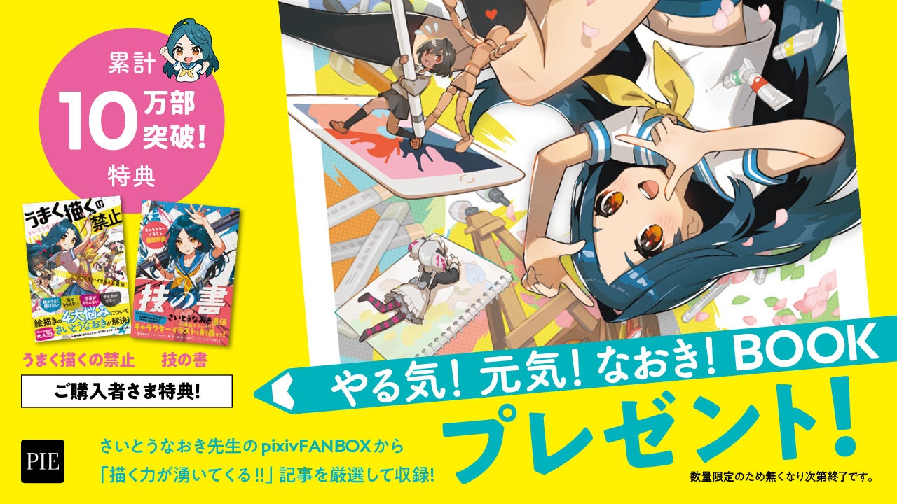 フェア開催店舗にて『うまく描くの禁止』『技の書』どちらかを購入いただいた方に、特典としてさいとうなおき先生のpixivFANBOXの一部記事をまとめた小冊子「やる気!元気!なおき!BOOK」を配布いたします。