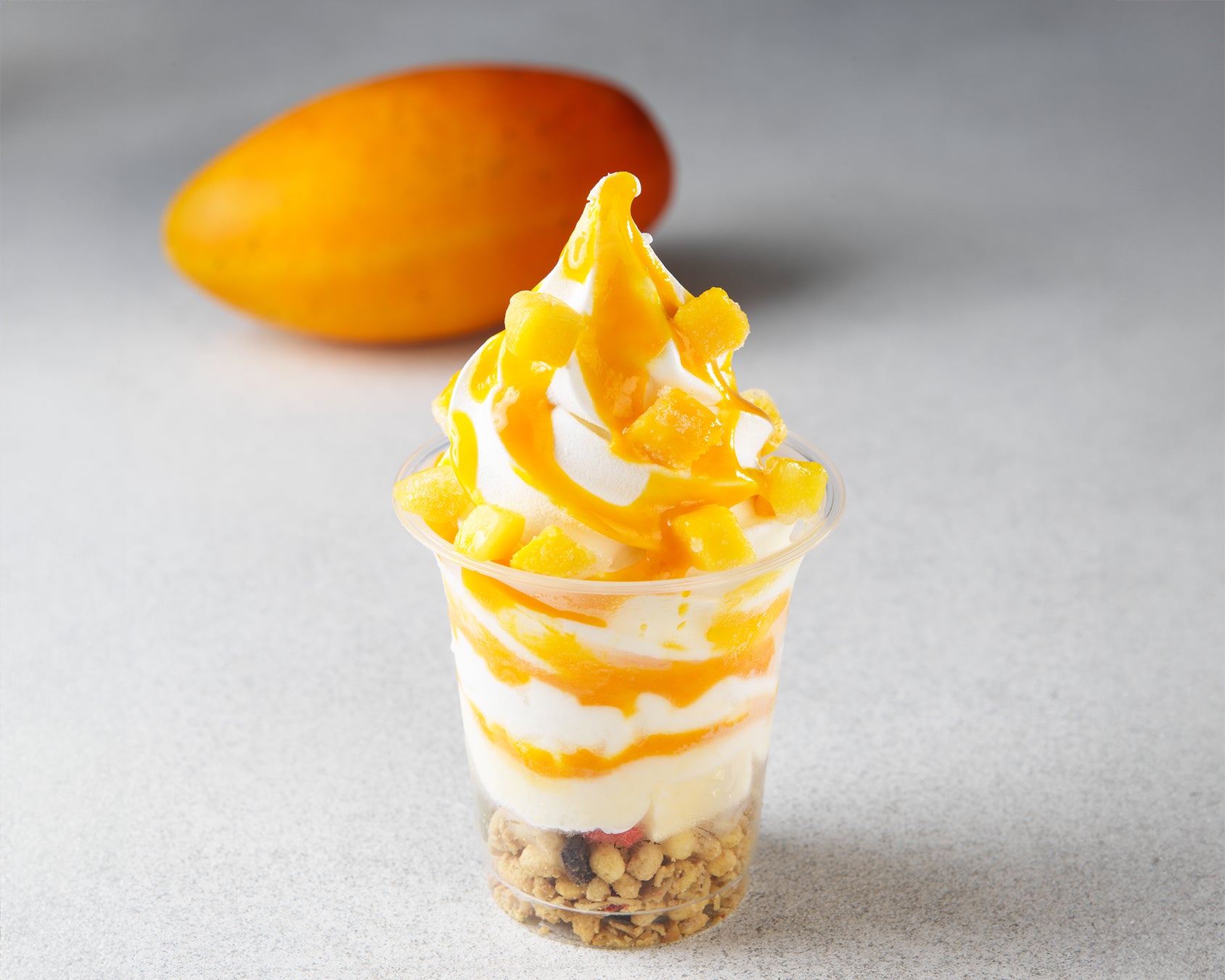 ザクザクとした食感のフルーツグラノーラを土台に、まろやかなチーズクリームとオリジナル生クリームを使用した、なめらかなベイクドチーズケーキを重ね、軽やかなホイップクリームとコク深いジャージーミルクのソフトクリームで仕上げました。さらに、マンゴーソースと果肉をトッピングし、一口ごとに異なる食感と爽やかな味わいをお楽しみいただけます。