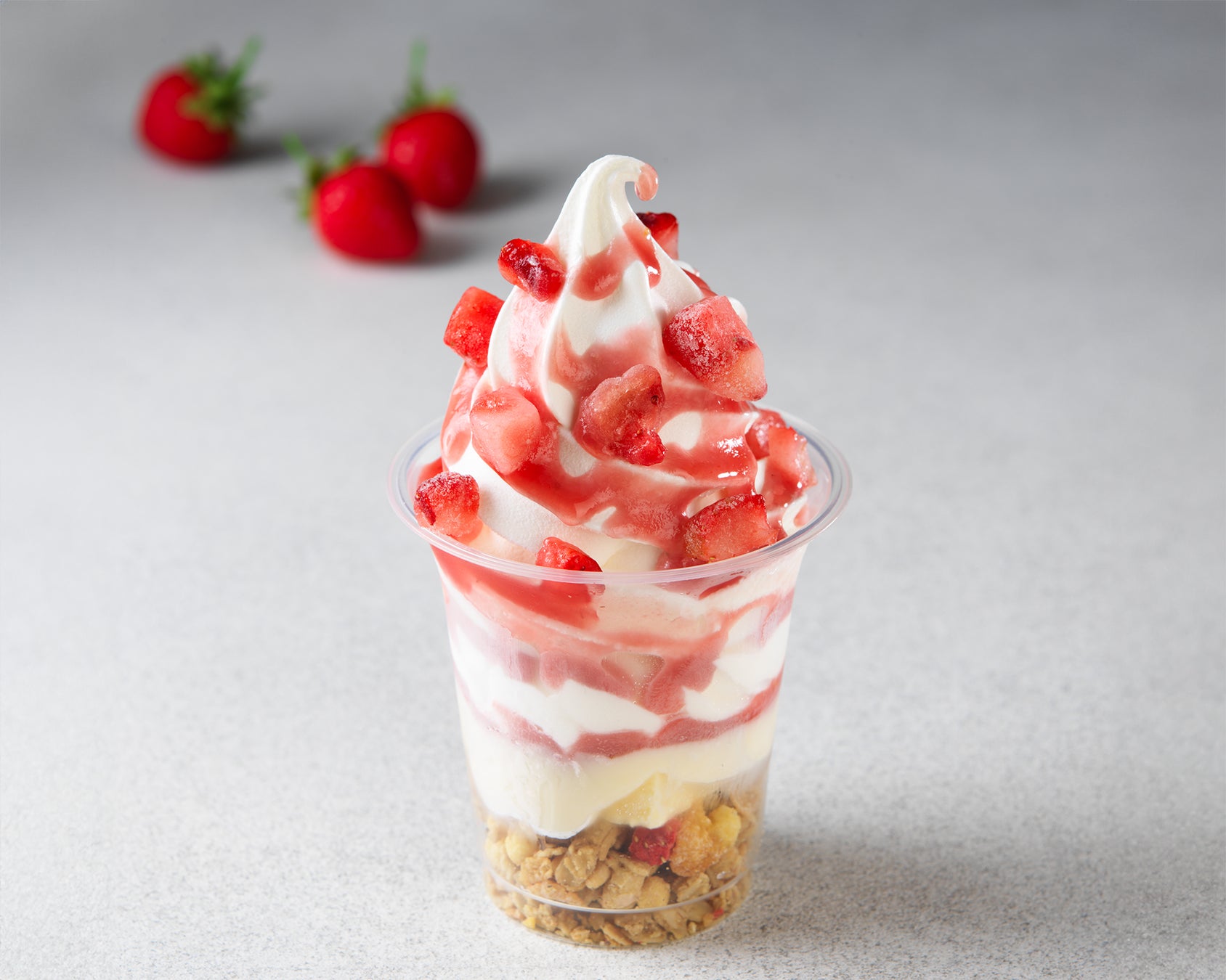 ザクザク食感のフルーツグラノーラを土台に、まろやかなチーズクリームとオリジナル生クリームを使用した、口どけの良いベイクドチーズケーキを重ねました。さらに、軽やかなホイップクリームとコク深いジャージーミルクソフトを重ね、苺のソースとダイスをトッピング。一口ごとに爽やかな甘酸っぱさと豊かな風味をお楽しみいただけます。