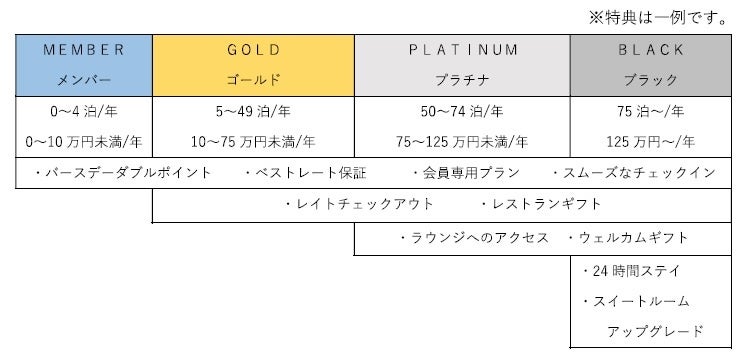 一年間のご利用金額やご宿泊数により4段階のステータス制を導入し、ステータスに応じた多彩な特典・サービスを提供します。