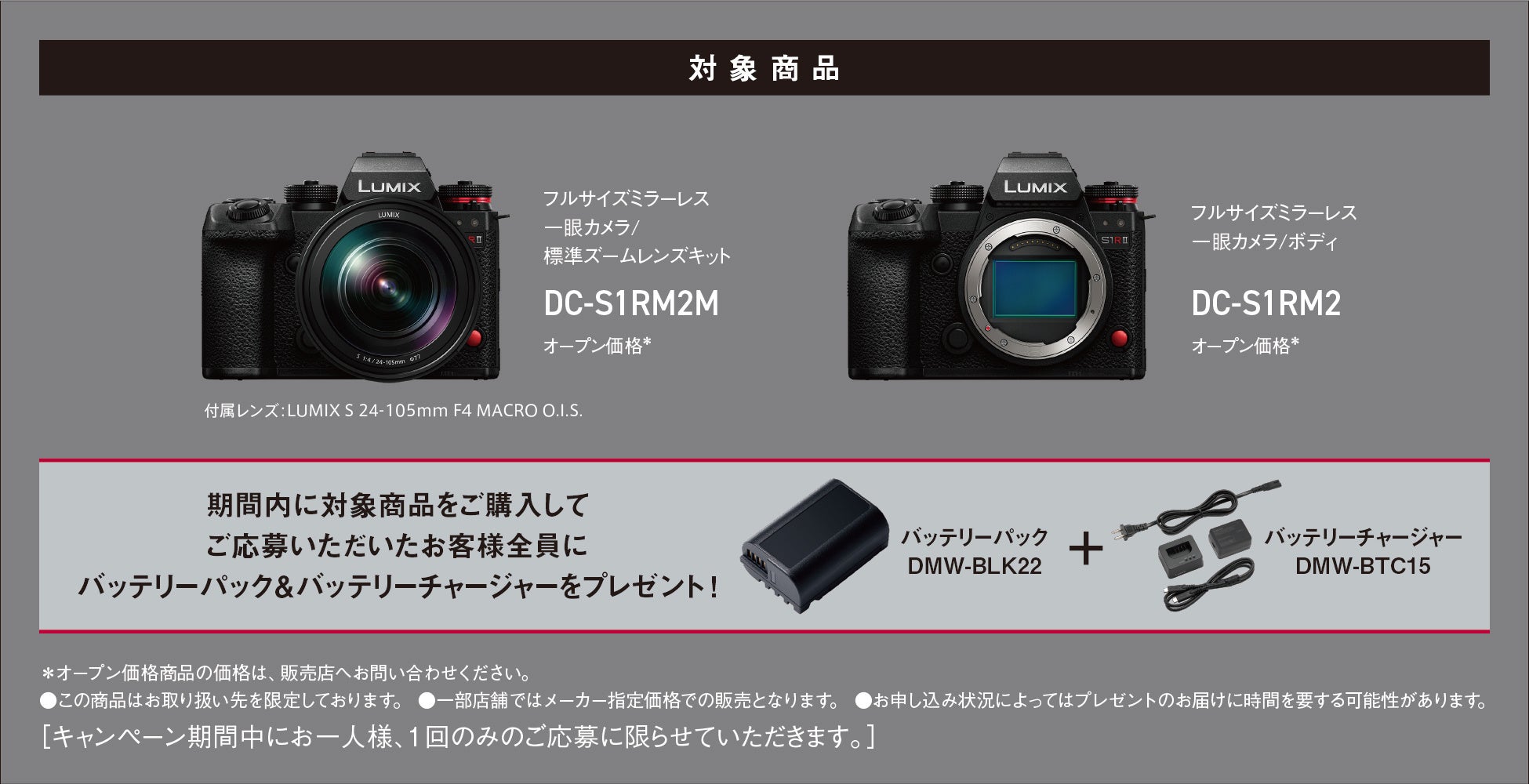 ※ご応募は、対象のボディまたはレンズキット1台のみ(DC-S1RM2、DC-S1RM2Mのいずれか1台)