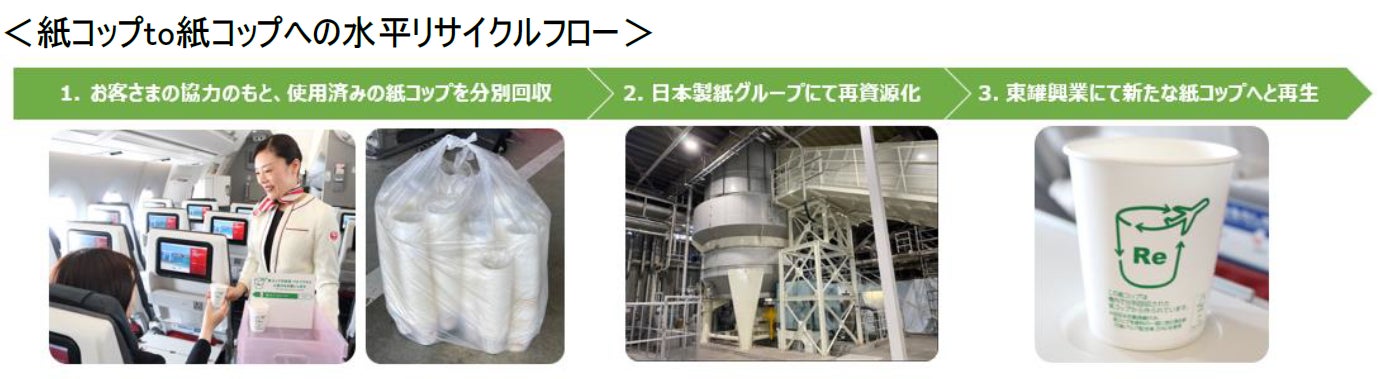 日本航空株式会社(本社:東京都品川区、代表取締役社長:鳥取 三津子、以下「JAL」)、日本製紙株式会社(本社:東京都千代田区、代表取締役社長:野沢 徹、以下「日本製紙」)、東洋製罐グループホールディングス株式会社の連結子会社である東罐興業株式会社(本社:東京都品川区、代表取締役社長:笠井 俊哉、以下「東罐興業」)は、機内で分別回収した使用済み飲料用紙コップを新たな紙コップに再生する「紙コップto紙コップ」の水平リサイクルを実現しました。使用済みの紙コップを回収して再資源化し、新たな紙コップに再生させる資源循環は国内初の取り組みです。(2024年5月7日時点 三社調べ) この取り組みにより新たに再生された紙コップ(以下「再生紙コップ」)は、環境月間である6月に羽田発JAL国内線運航便にて提供します。