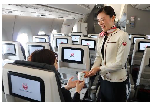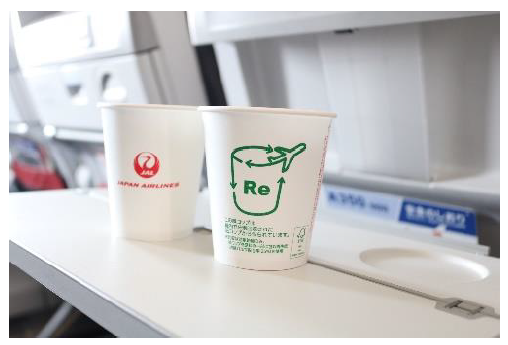 JALグループでは、日本製紙グループと共同で、2022年12月より機内サービスで使用した紙コップの分別回収とリサイクルを実施してまいりました。紙コップの回収対象路線は、東京(羽田)=沖縄(那覇)線からスタートし、現在は東京(羽田)=札幌(新千歳)・旭川・福岡・長崎・熊本・鹿児島・沖縄(那覇)線に拡大しています。(エアバスA350-900型機・ボーイング767-300ER型機運航便が対象)※