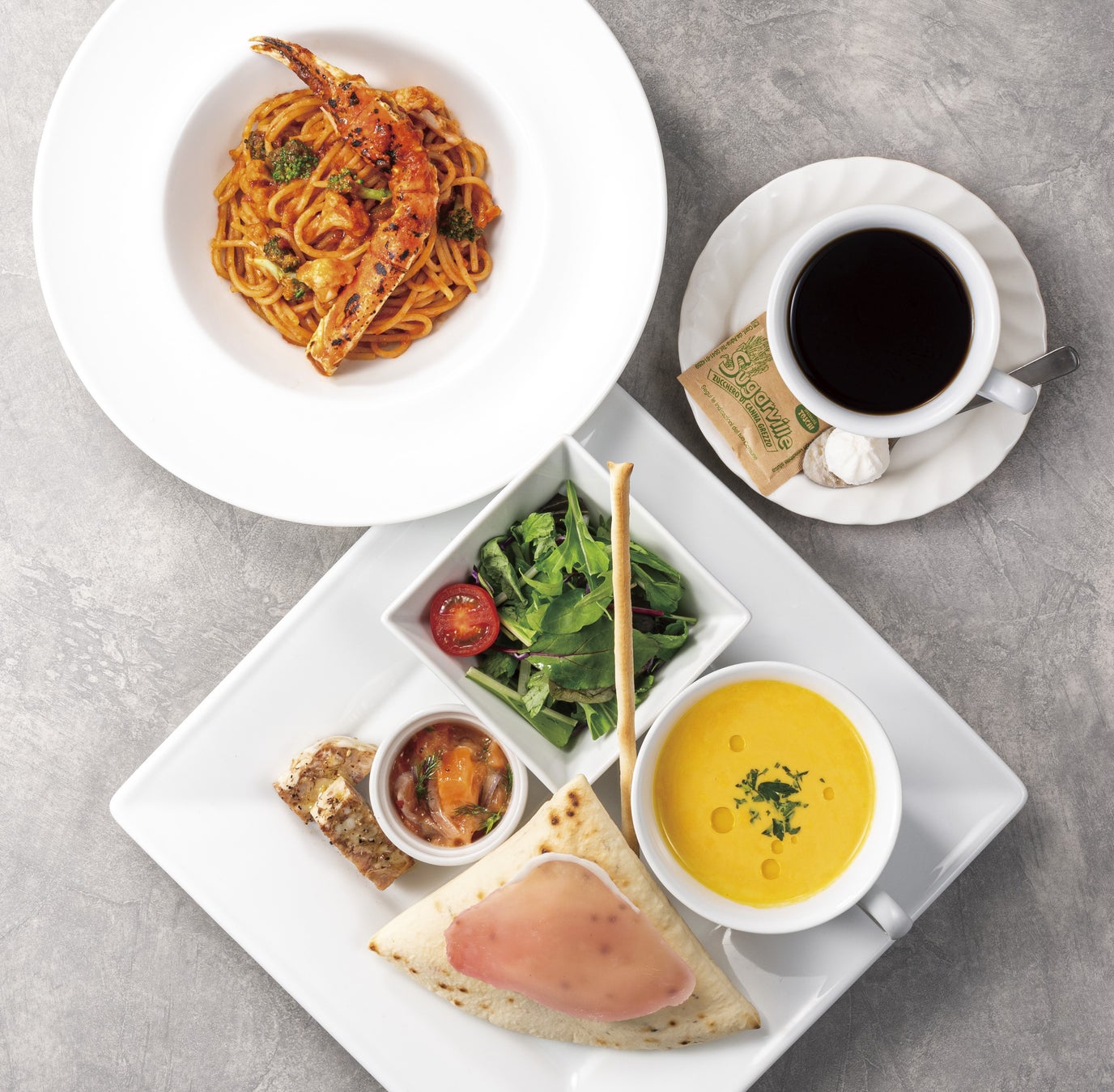 ワンプレートに盛り込んだ前菜5種、焼きズワイ蟹と花野菜のトマトソーススパゲッティ ハーフサイズ、ドリンク