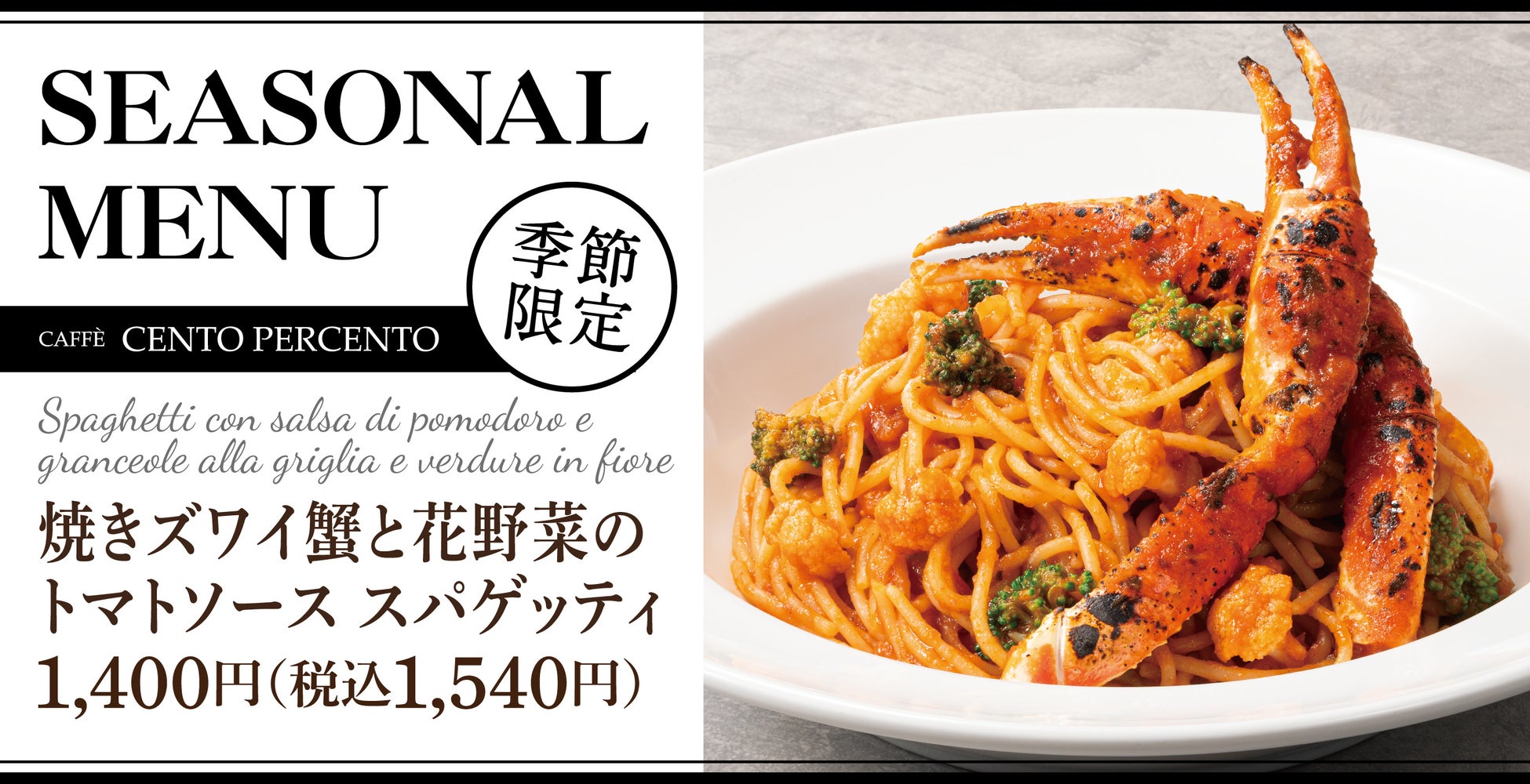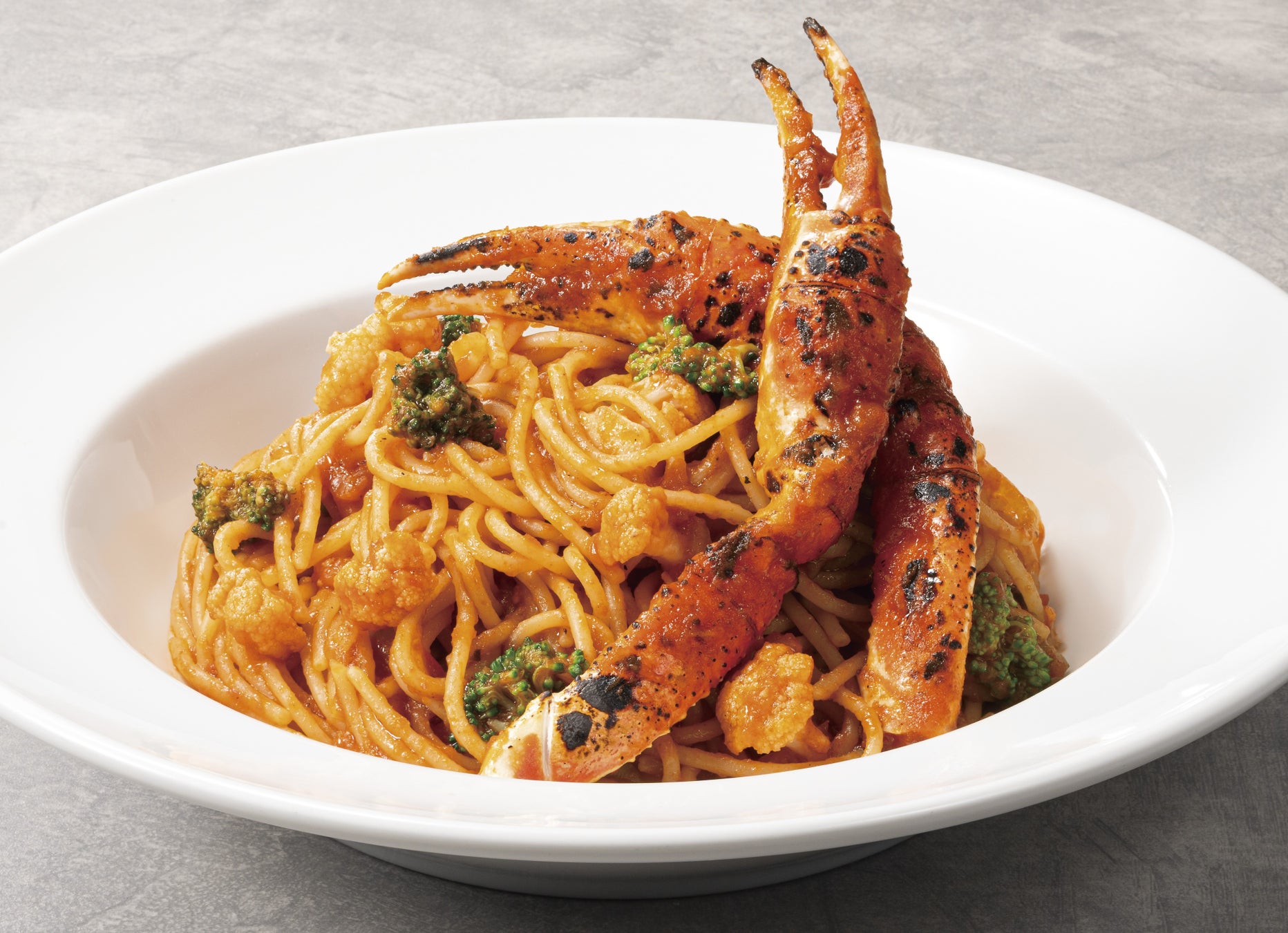 年末年始に相応しい華やかな一皿を「焼きズワイ蟹と花野菜のトマトソース スパゲッティ」チェントペルチェントに新登場。