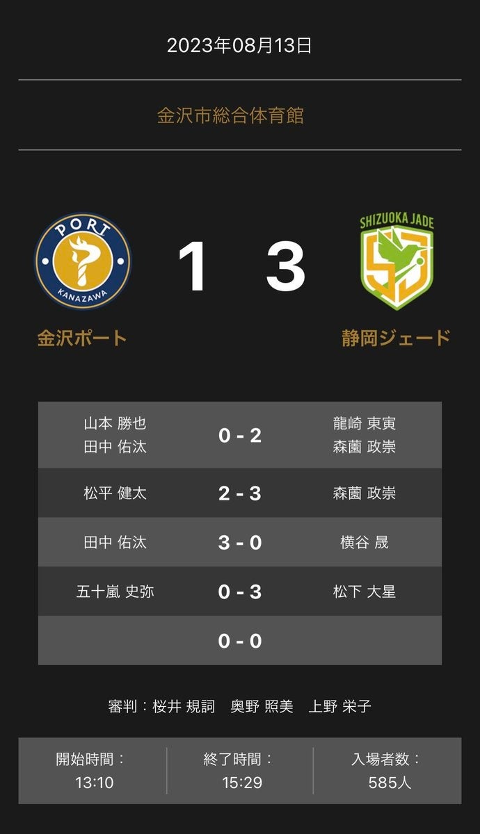 ノジマTリーグ2023-2024シーズン公式戦 8月13日(日)13:00試合開始 金沢ポート vs 静岡ジェード 試合結果