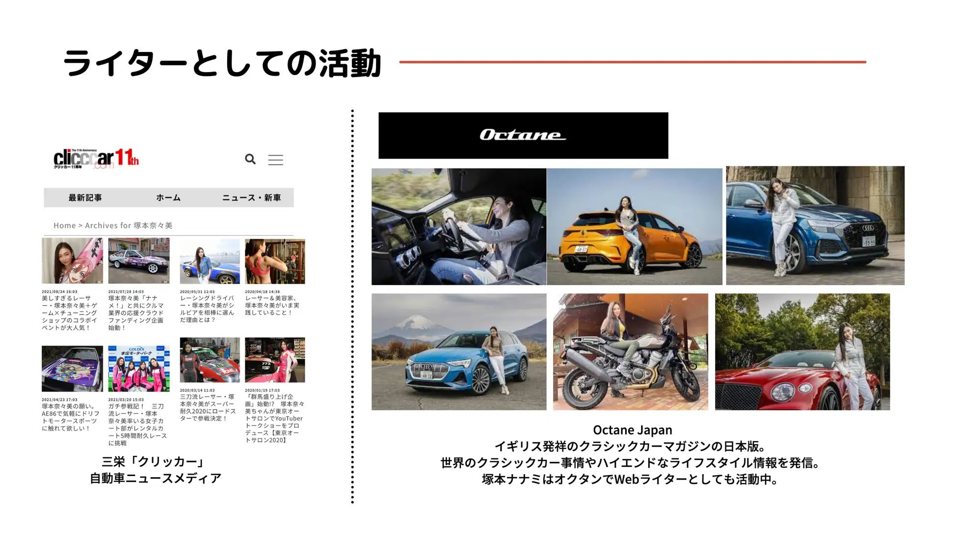 バンダイナムコ「ドリフトスピリッツ」7周年アンバサダー、山梨県やまなし大使、女子カート部(JKB)部長、そのほかモデル・タレントとしてTV・CM・イベントなどでも活躍。