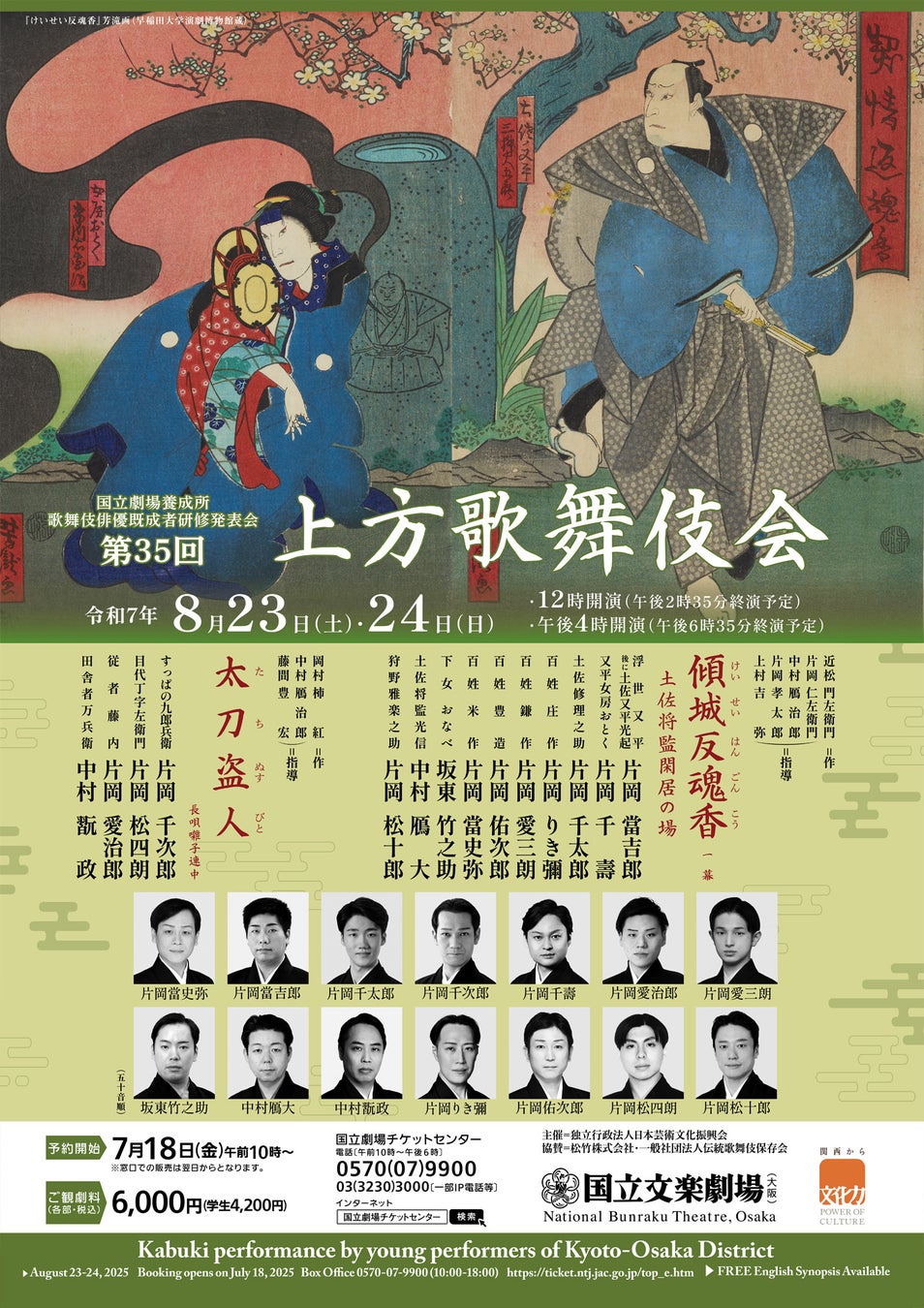 人形浄瑠璃文楽をはじめとして、舞踊、邦楽、大衆芸能など様々なジャンルの上方芸能を上演している大阪・国立文楽劇場。普段は文楽の上演が多い劇場ですが、年に1回、「上方歌舞伎会」を主催公演として皆様にお届けしています。「上方歌舞伎会」は、上方歌舞伎の伝承を目的として若手俳優たちが大役に挑む公演で、今年で35回を数えます。