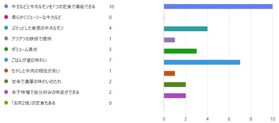 調査内容:『牛カルビと牛ホルモン焼の定食』のおすすめポイントを選択肢の中から2つ選択