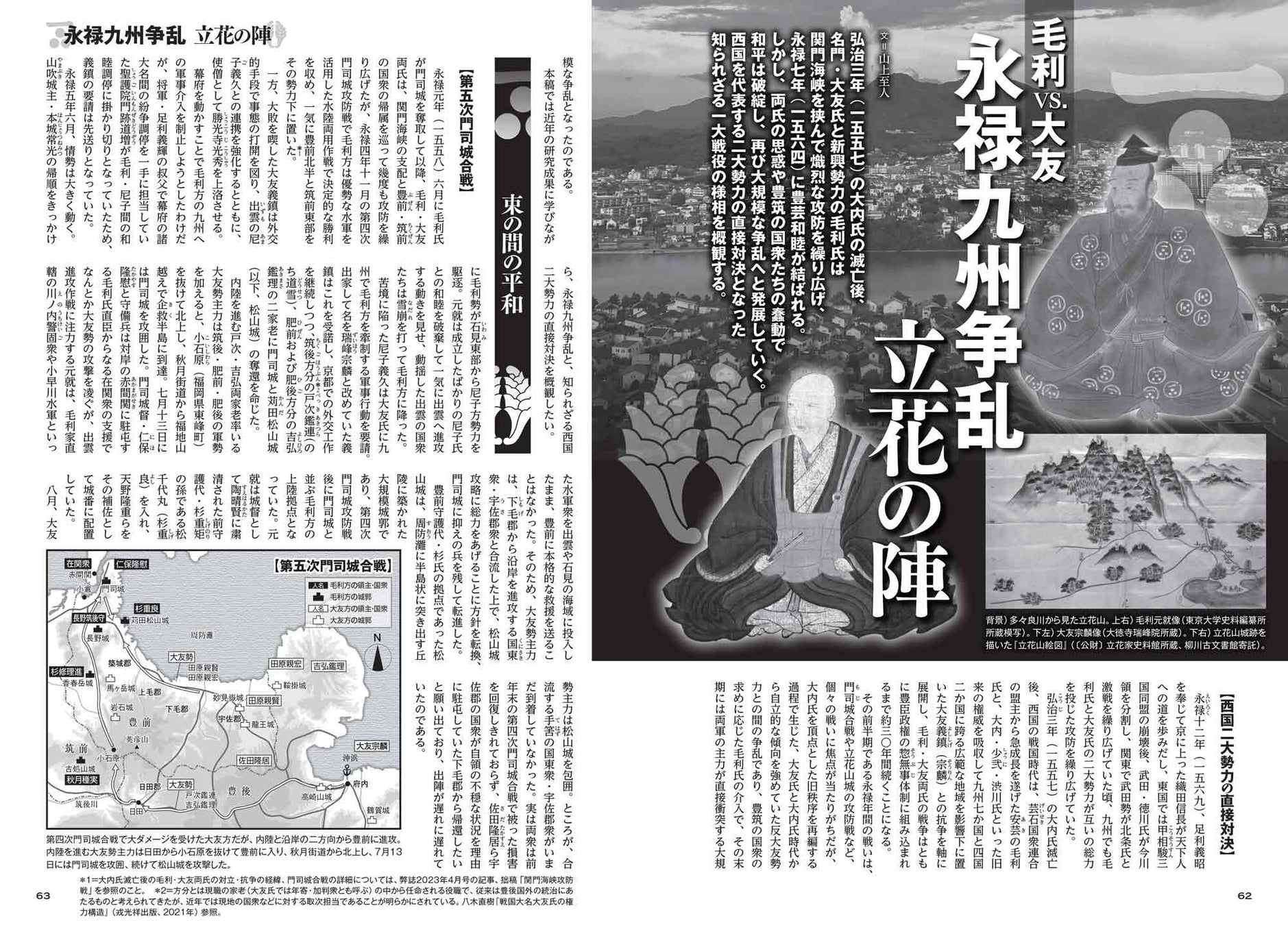 第三特集「毛利vs.大友 永禄九州争乱ー立花の陣」は、関門海峡を挟み、北部九州の国衆たちをも巻き込んで展開された、西国を代表する二大勢力ーー毛利元就と大友宗麟の直接対決となった、知られざる一大戦役の様相を概観します。