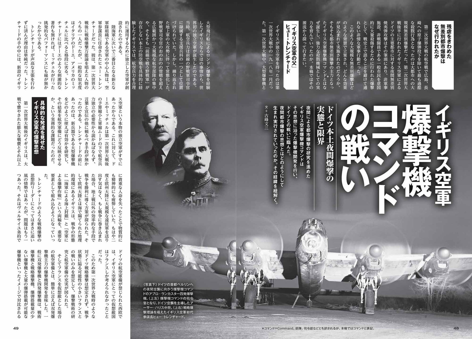 第二特集「イギリス爆撃機コマンドの戦い~ドイツ本土夜間爆撃の実態と限界」では、第一次世界大戦以降、イギリス空軍において戦略爆撃の思想がいかに形成されたのか。そして、第二次大戦のドイツとの戦争において、その思想を夜間都市爆撃として具現化したイギリス空軍爆撃機コマンドの作戦とはいかなるものだったのかについて詳解します。