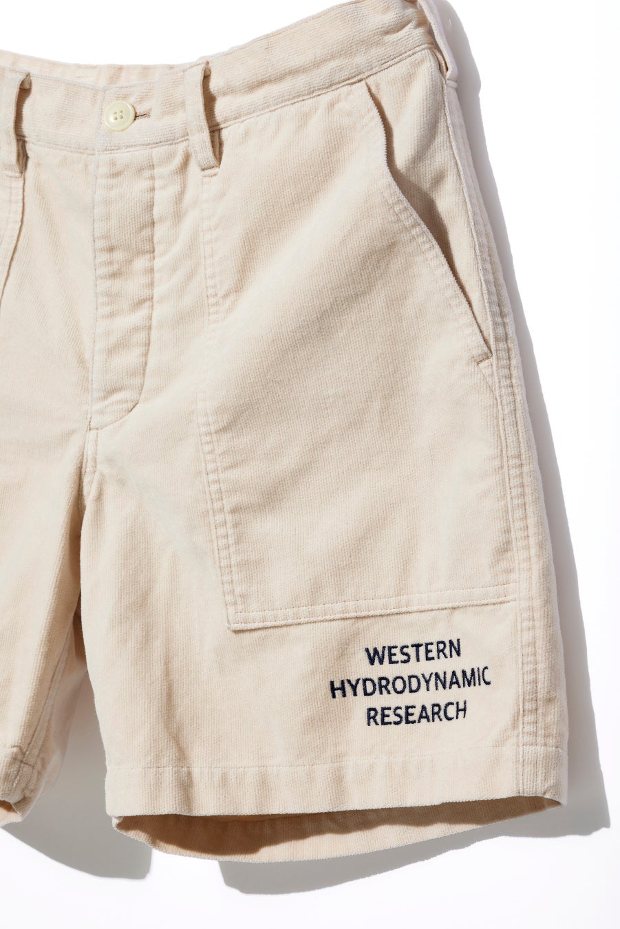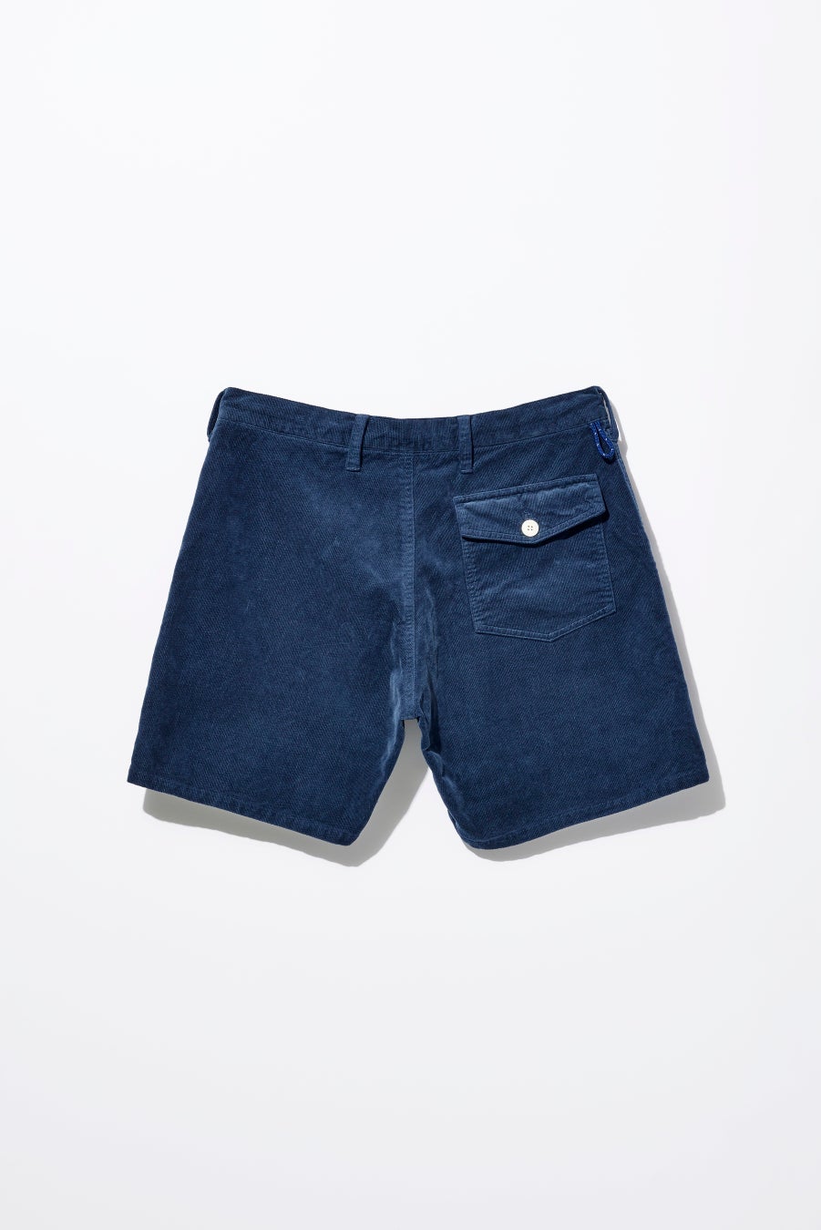 プリントをデザイン別注し、ヴィンテージライクなムラ感にこだわってピグメント染め(顔料染め)で染色したTシャツと、クラシックな細畝のコーデュロイ生地を使用し、ベイカーショーツ仕様に仕上げたショートパンツが完成しました。