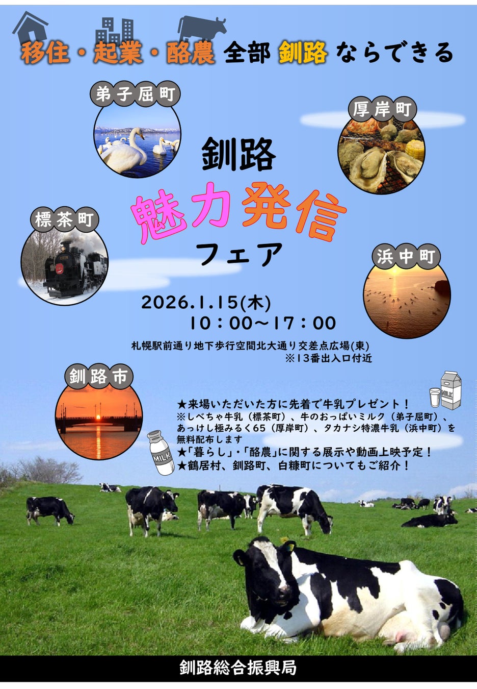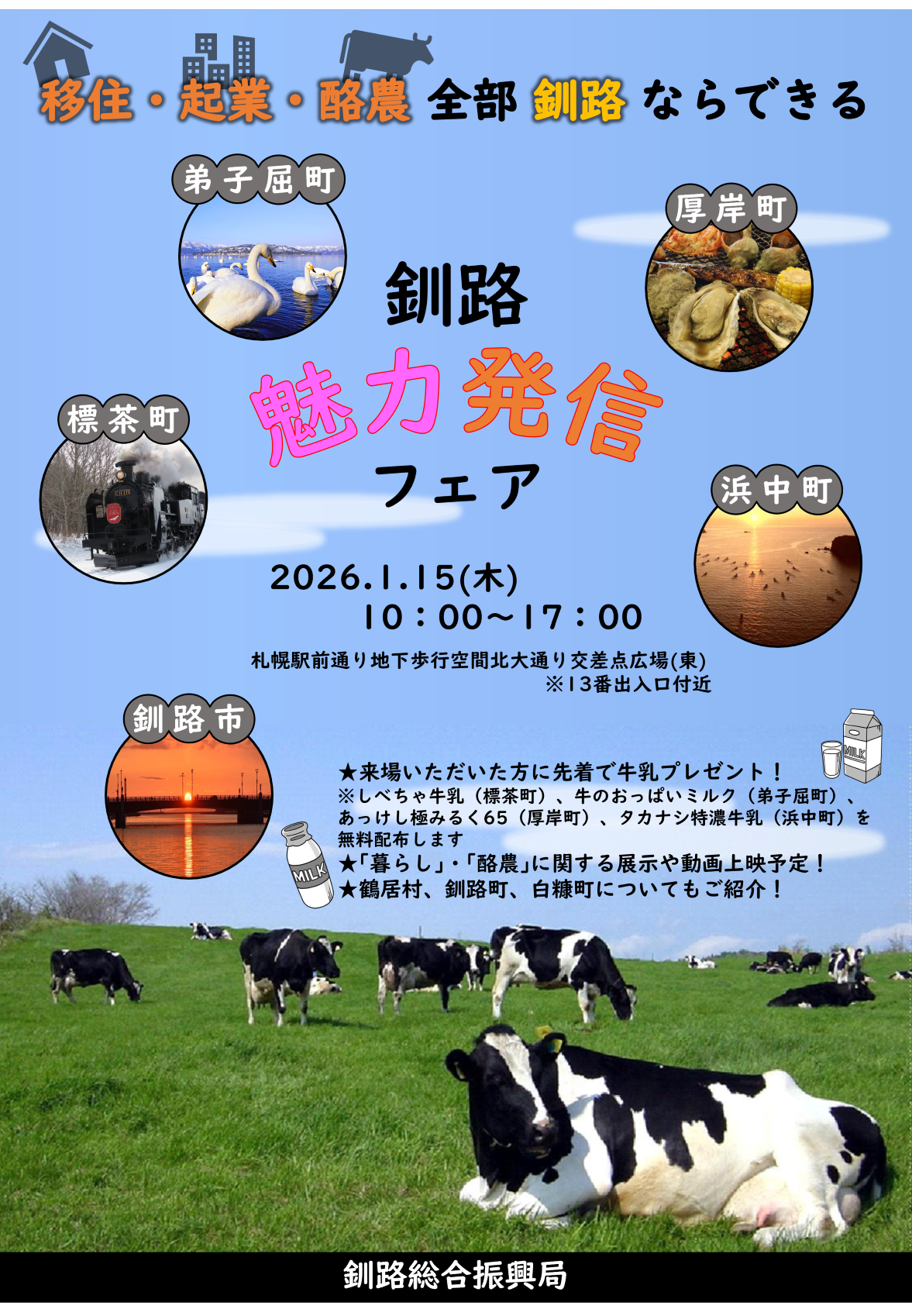 釧路地域の暮らしや、酪農を始めとする農業の魅力を発信することで、地域の知名度向上を図るとともに、新規就農への関心拡大及び交流・関係人口の創出を目的として、「釧路魅力発信フェア」を札幌駅前地下歩行空間で開催します。