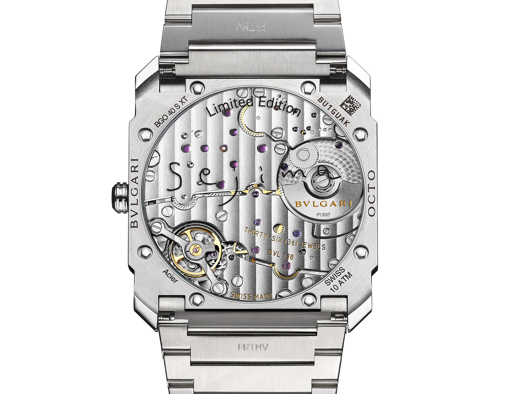 妹島氏のサインが入ったサファイアクリスタルのケースバックから見える、自動巻きマニュファクチュールムーブメント、BVLキャリバー138の動きが目を楽しませます。ミラー効果を再現した特別なステンレススティール製のボックスに収められ、360本限定で販売されます。