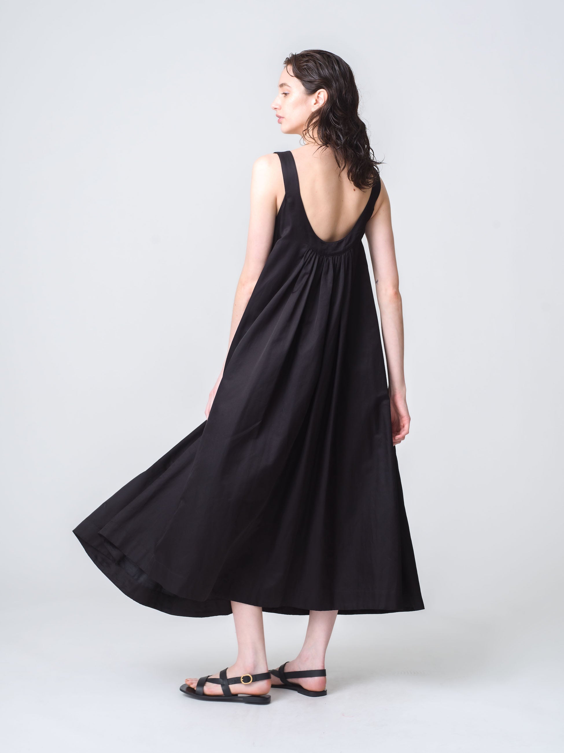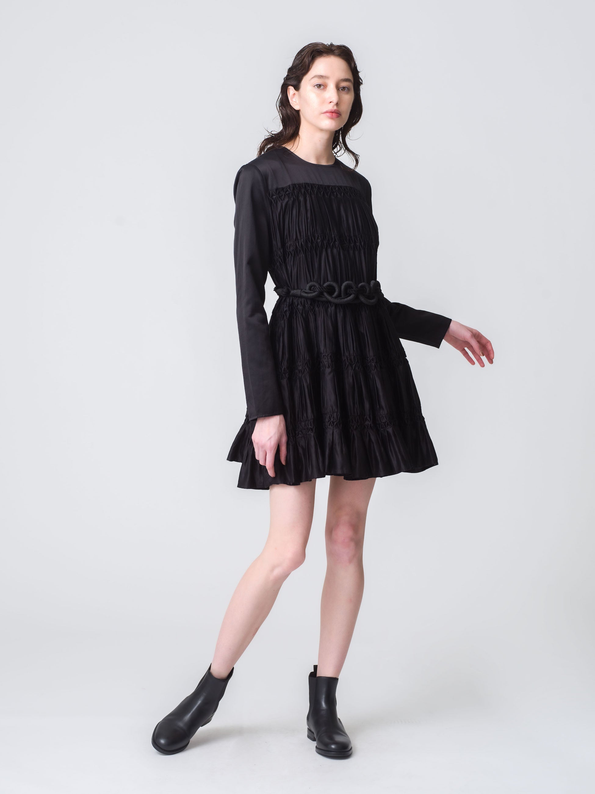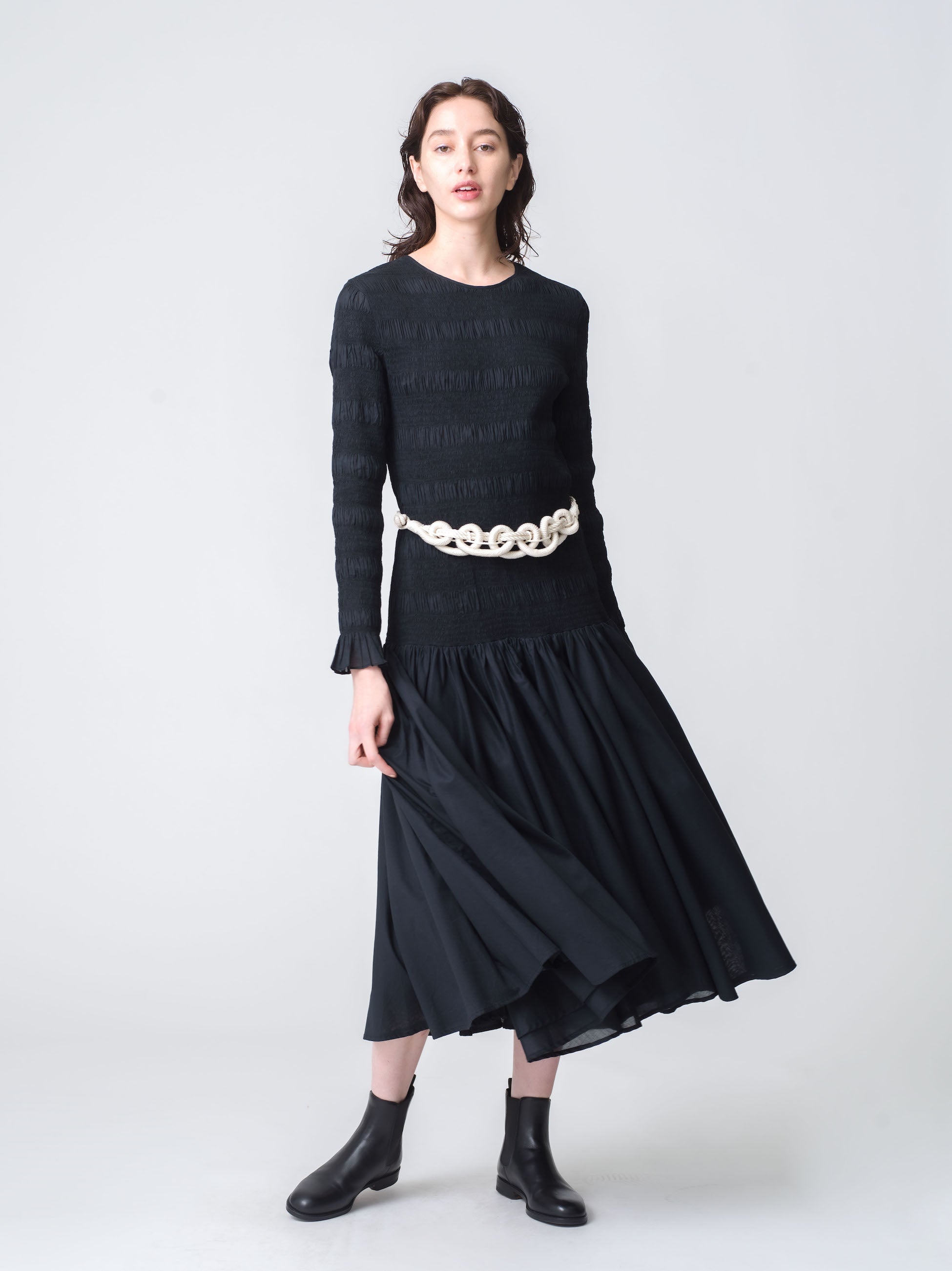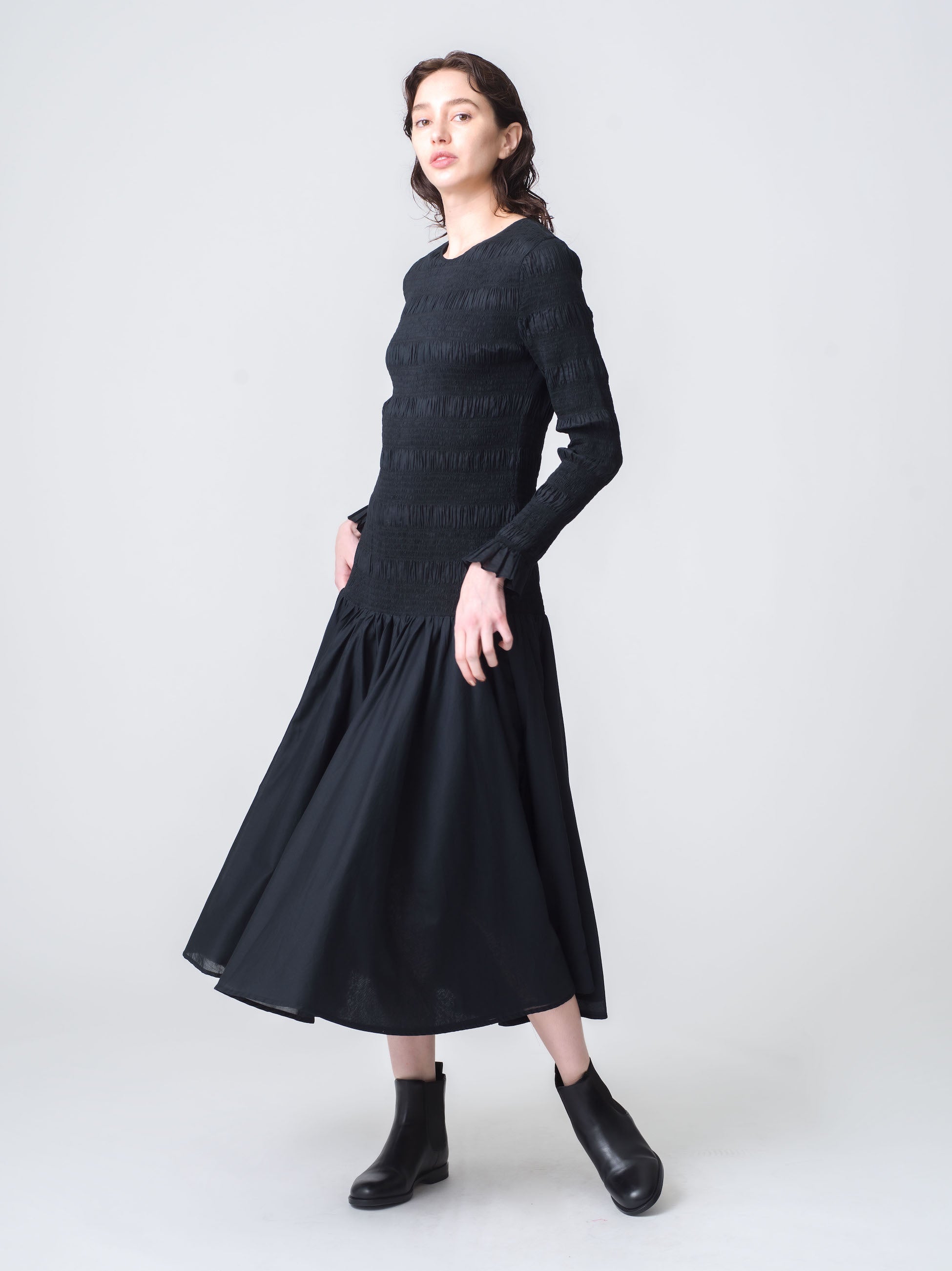 身体にフィットするボディーとふわっと広がるギャザースカートがエレガントなシルエットのドレス「シデン」。身頃全体に施されたスモッキングは伸縮性があり、快適で着心地の良いデザインです。軽量で滑らかなコットンシルク素材を使用しています。