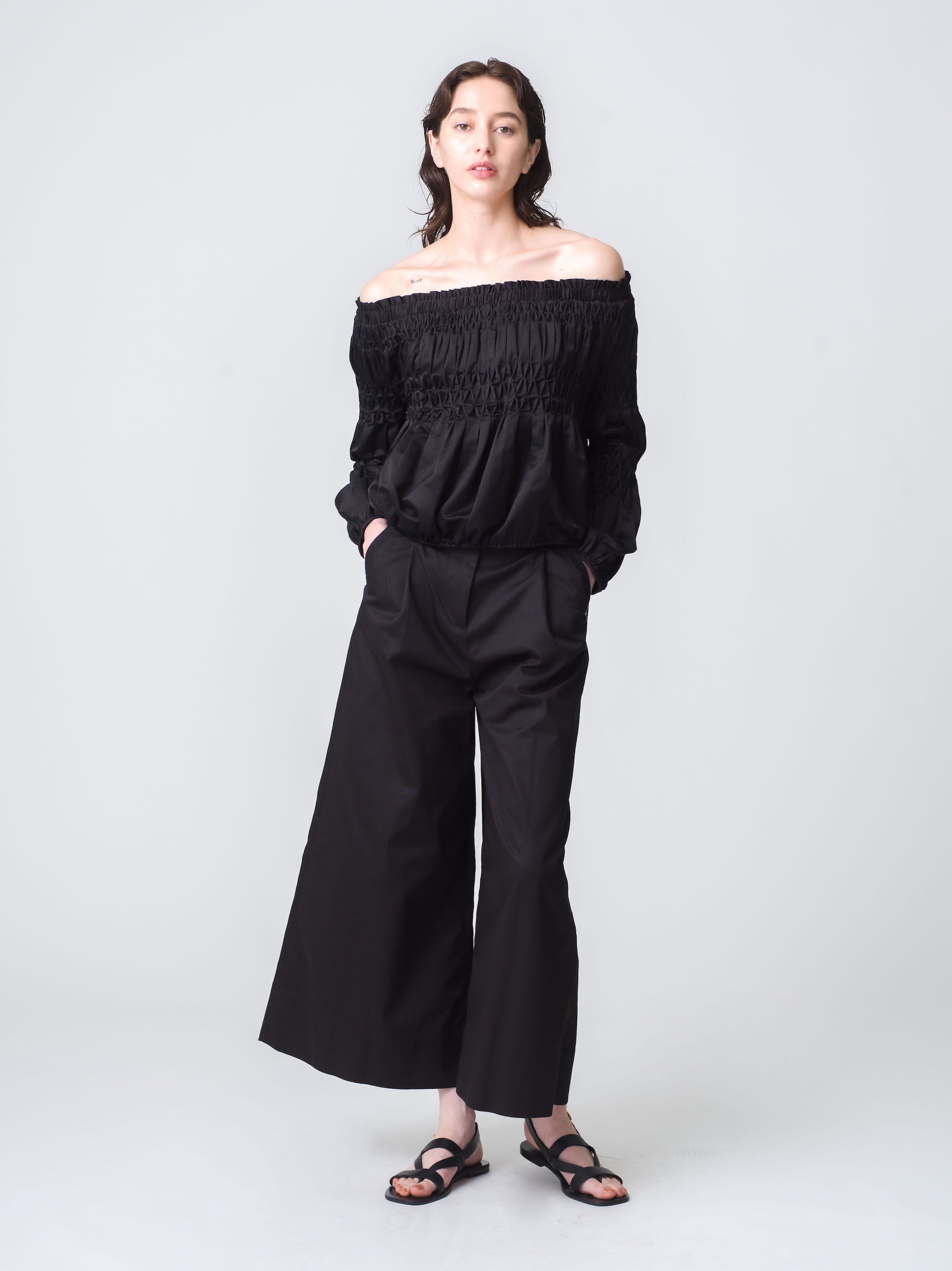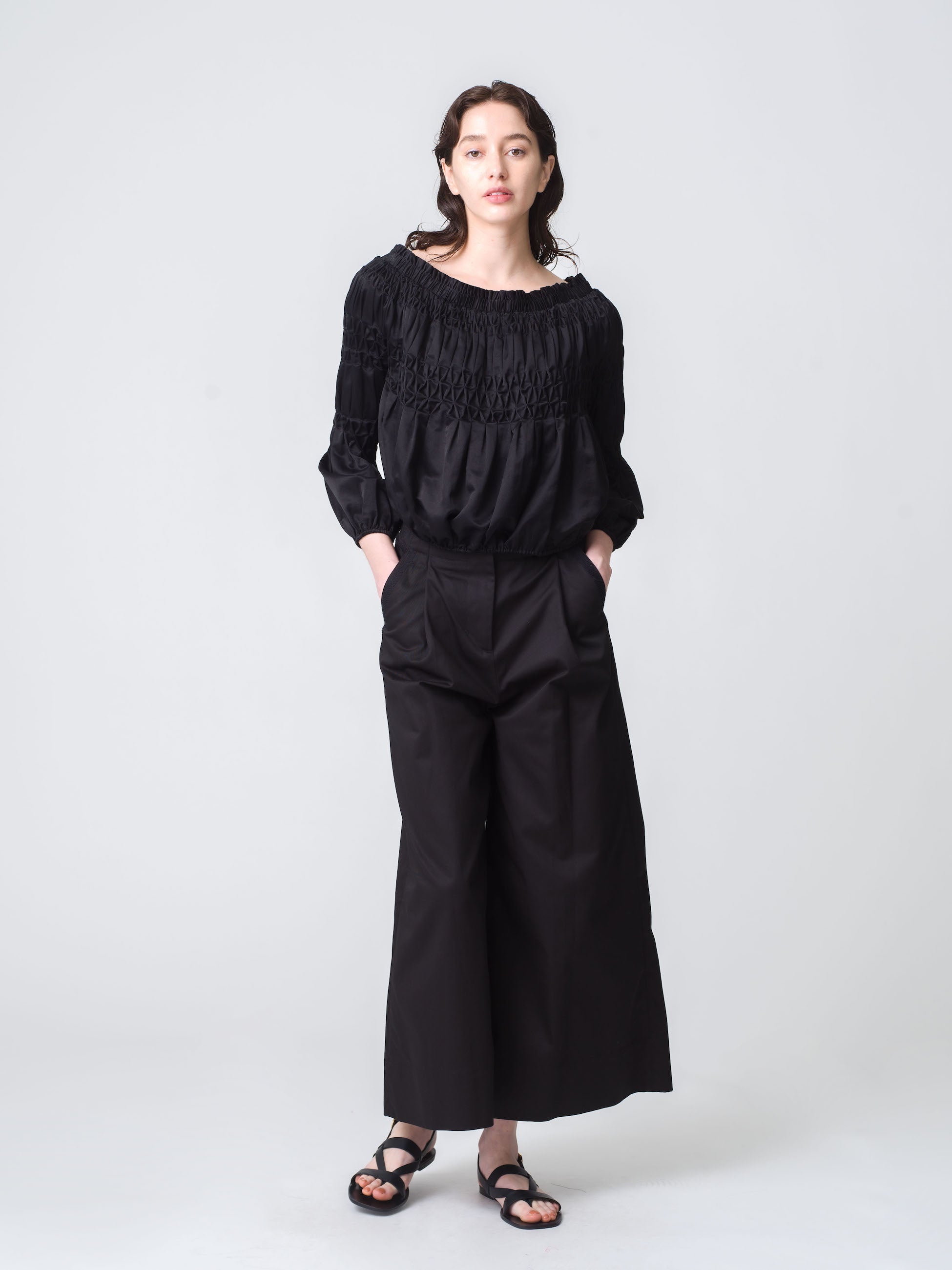 Merletteのシグネチャーであるダイアモンド柄のハンドスモッキング刺繍をあしらったエレガントなイブニングブラウス「アボット」。オフショルダーとボリューミーな袖がポイント。上質で軽量なコットンシルク素材を使用し、優美な存在感を放つコーディネートの主役になるアイテムです。