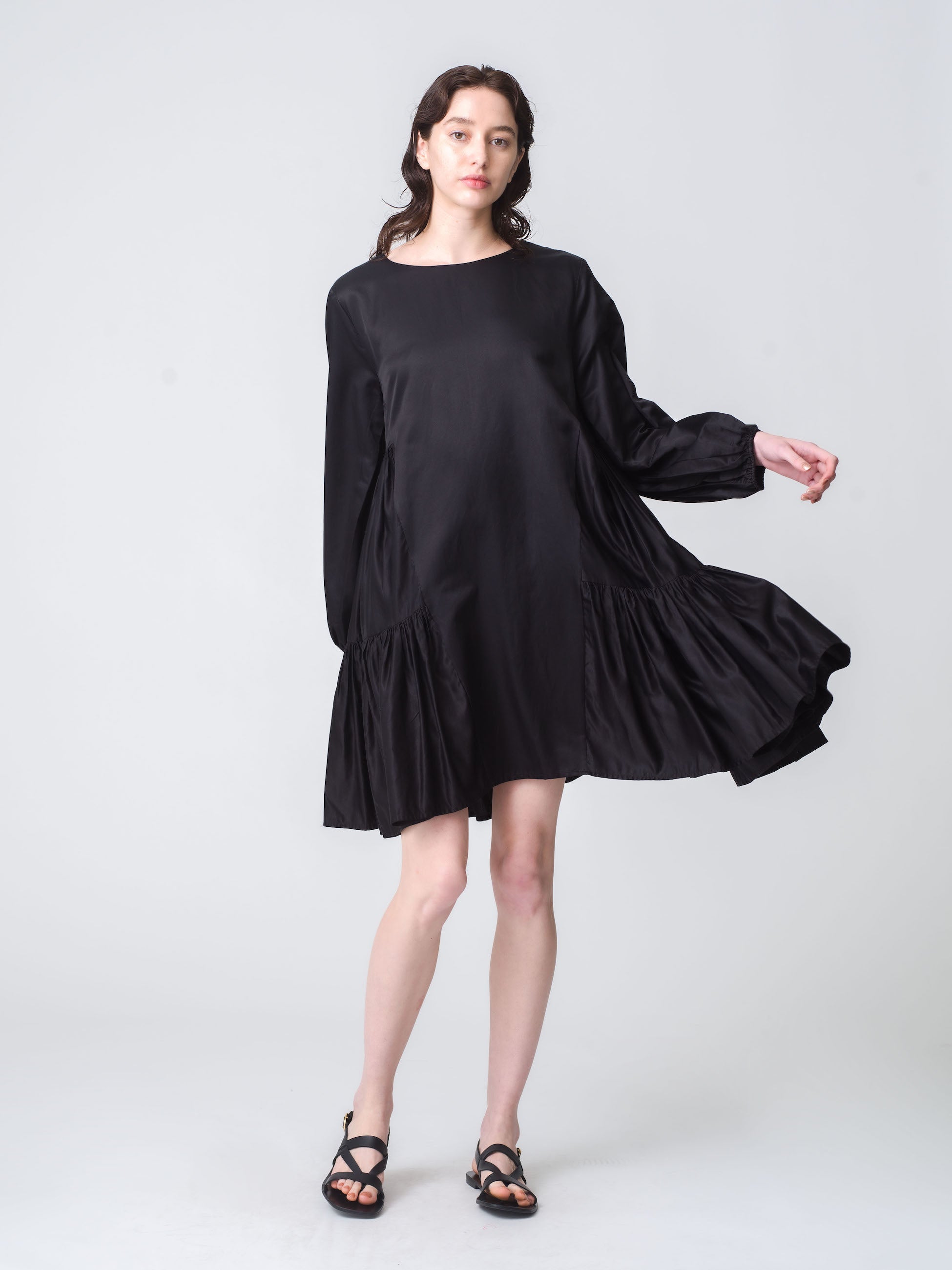 ゆるやなかパフスリーブと裾に広がるサイドのティアードで、立体的なシルエットに仕上げています。