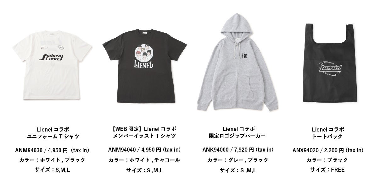 今回のコラボレーションでは、「Lienel」が監修・デザインしたTシャツ、パーカー、トートバックを展開。フットボールユニフォームをイメージしたスポーティなデザインや、「Lienel」のメンバーのイラストを施した、ユニセックスで身に着けられるアイテムラインアップです。