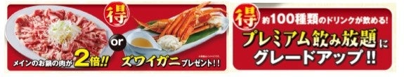 「彩り味自慢コース」では、どちらもお得な選べる特典「ズワイガニプレゼント」or「メインの鍋のお肉2倍」をご用意!さらに約100種類のドリンクが楽しめる「プレミアム飲み放題」に無料グレードアップ付き!