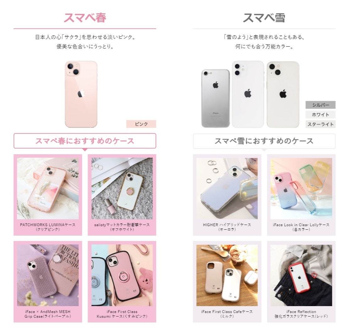 スマべ診断の特設ページでは、ピンクベースのスマホは「スマべ春」、ホワイトベースのスマホは「スマべ雪」のようにスマべを10種類に分類。スマべごとに「本当に似合うカラーのケース」を選定しています。