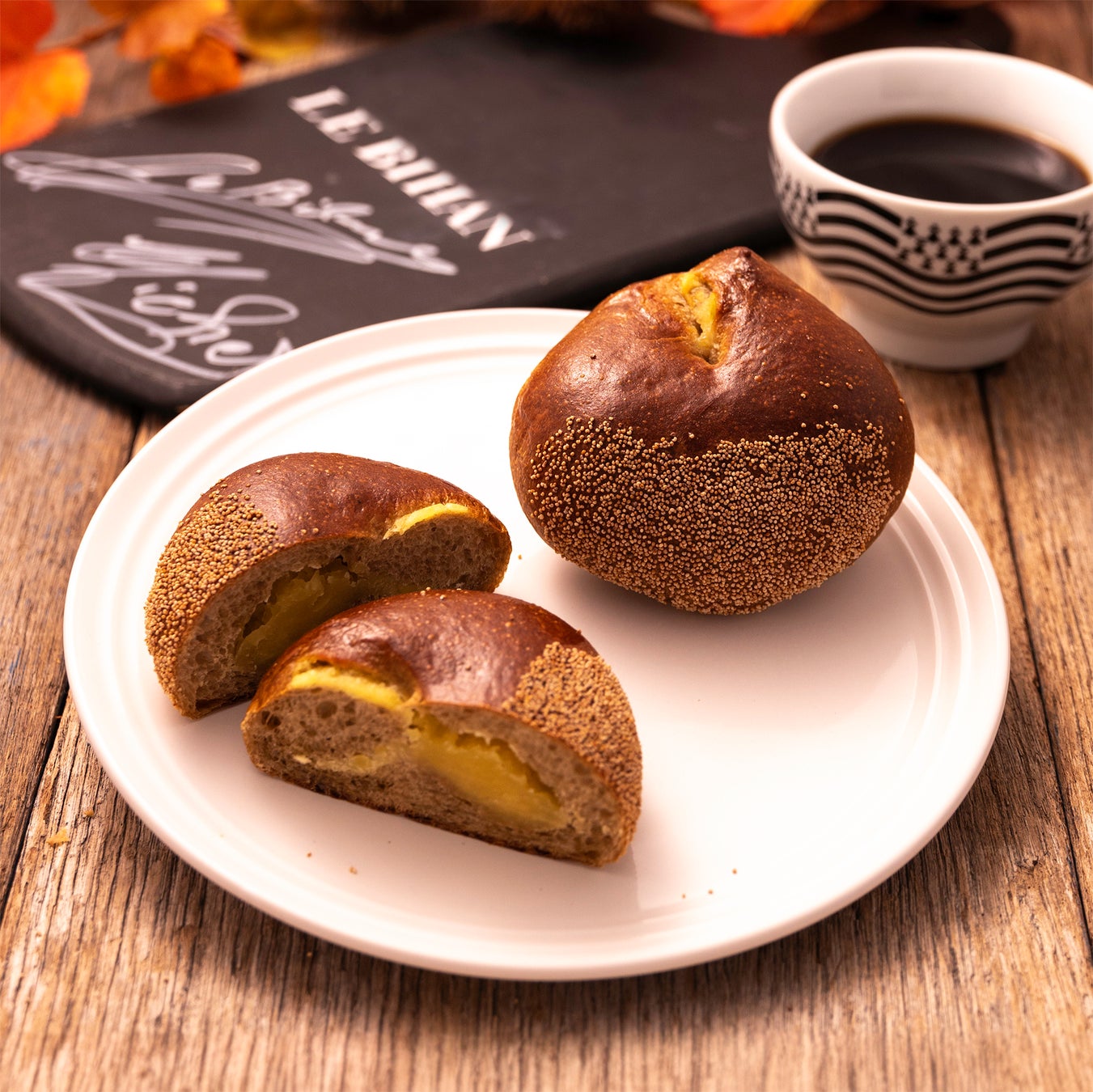 香り豊かなほうじ茶の生地に栗餡を包んだ、秋限定のあんぱん。けしの実のプチプチとした食感がアクセント。