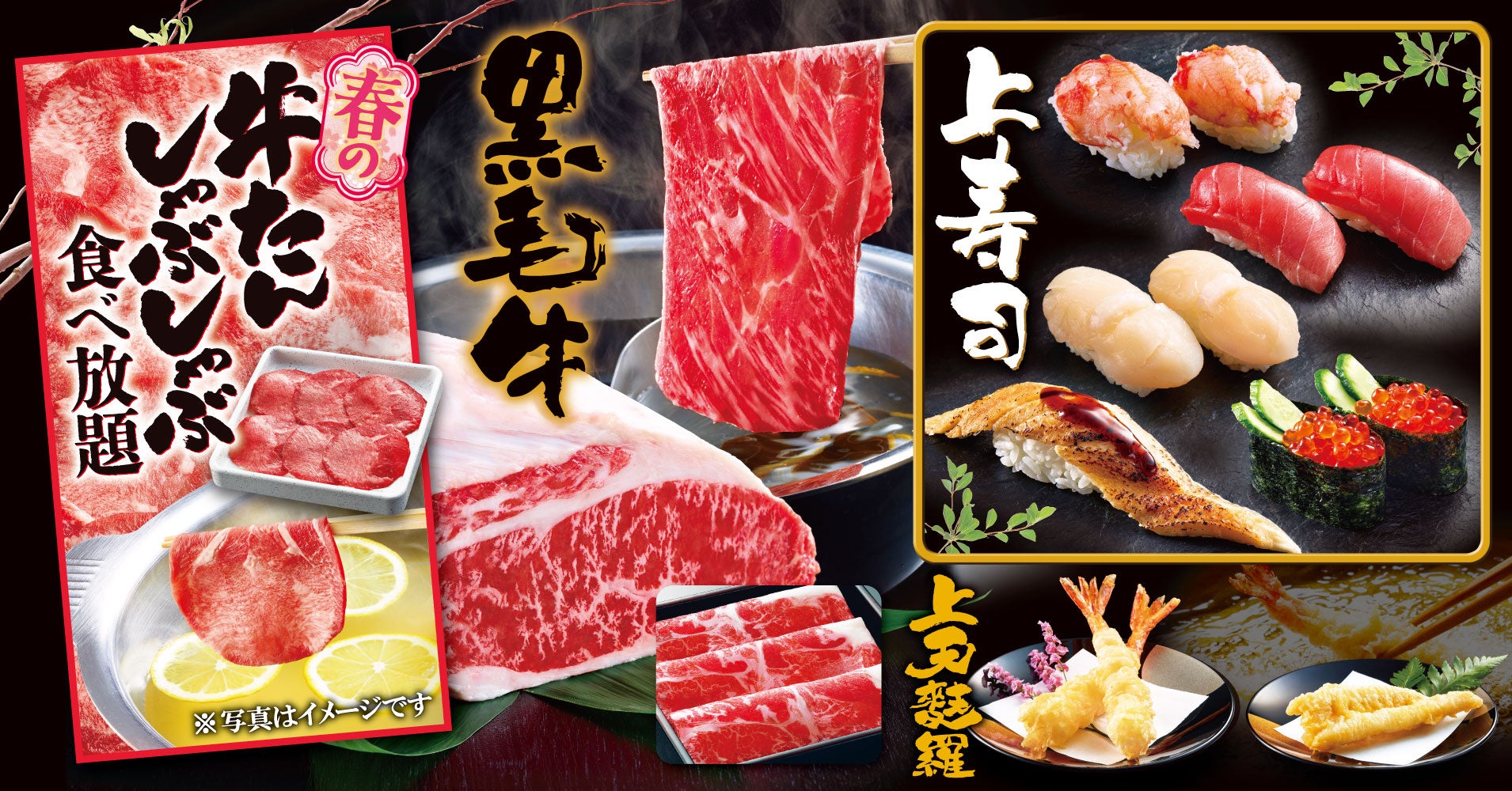牛たんや黒毛牛のしゃぶしゃぶをはじめ、上寿司の「中とろ握り」、「特大炙り上穴子握り」など、およそ120品を超えるメニューが食べ放題でお楽しみいただけます。