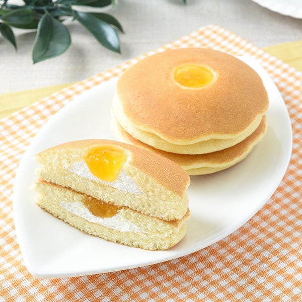 【内容】ふっくらとした食感のパンケーキに愛媛県産清見のゼリーと、相性の良いミルク風味のホイップクリームをはさみました。上側の生地をリング状に焼くことで清見ゼリーのオレンジ色が見える、見た目にも華やかなパンケーキです。