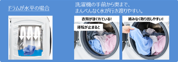 2.洗濯物が絡みにくく、洗いムラを抑える水平ドラムを採用