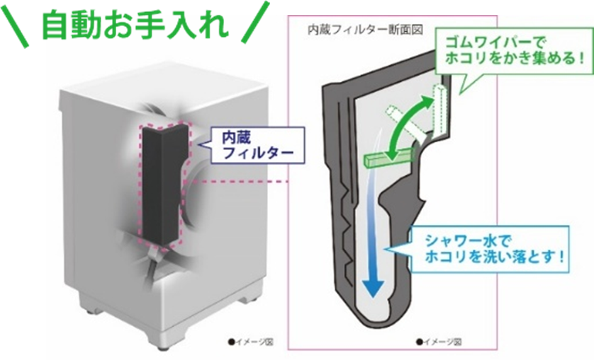 内蔵している乾燥フィルターは自動お掃除機能付き。フィルターの詰まりによる乾燥効率の低下を抑えます。