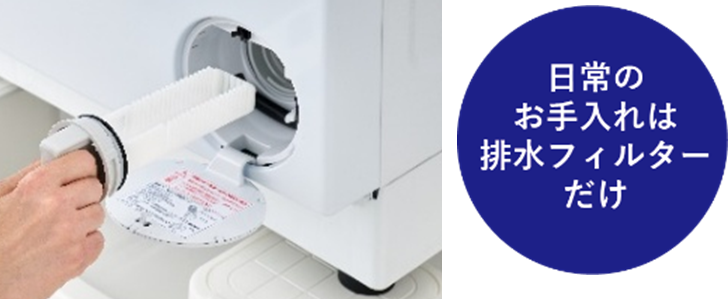 乾燥フィルター自動お掃除や、ドアパッキン自動お掃除によって洗い流された糸くず・ホコリをしっかりキャッチします。日常のお手入れは排水フィルタ―だけで十分です。
